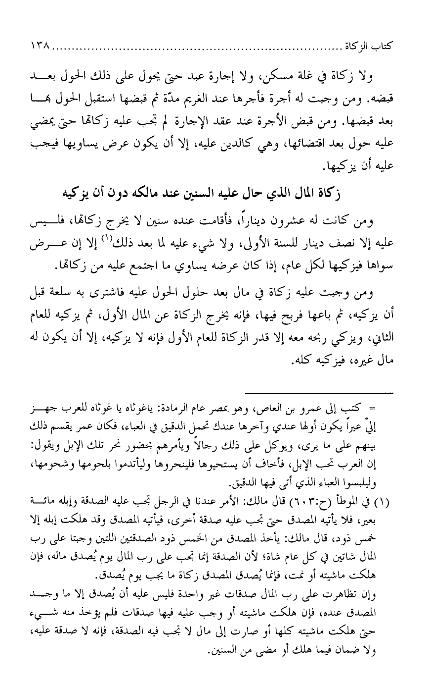 ولا زكاة في غلة مسكن، ولا إجارة عبد حتى يحول على ذلك الحول بعد قبضه. ومن وجبت له فأجرها عند الغريم مدّة ثم قبضها استقبل الحول بها بعد قبضها. ومن قبض الأجرة عند عقدالإجارة لم تجب عليه زكاتها حتى يمضي عليه حول بعد اقتضائها، وهي كالدين عليه، إلا أن يكون عرض يساويها فيجب عليه أن يزكيها.
