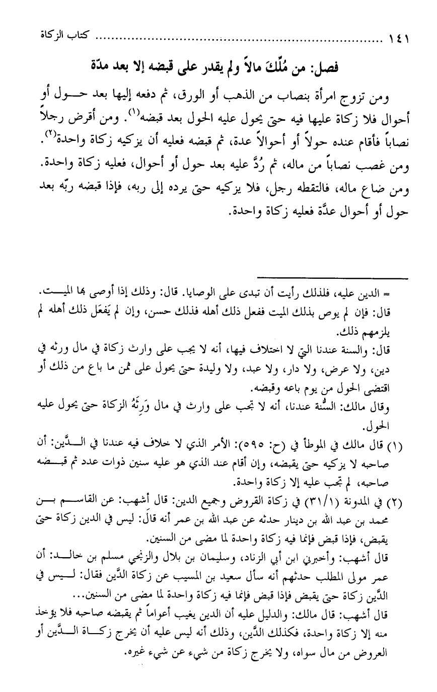 ومن تزوج امرأة بنصاب من الذهب أو الورق، ثم دفعه إليها بعد حول أو أحوال فلا زكاة عليها فيه حتى يحول عليه الحول بعد قبضه. ومن أقرض رجلاً نصابًا فأقام عنده حولاً أو أحوالاً عدة، ثم قبضه فعليه أن يزكيه زكاة واحدة. ومن غصب نصابًا من ماله، ثم رُدَّ عليه بعد حول أو أحوال، فعليه زكاة واحدة، ومن ضاع ماله، فالتقطه رجل، فلا يزكيه حتى يرده إلى ربه، فإذا قبضه ربّه بعد حول أو أحوال عدَّة فعليه زكاة واحدة.