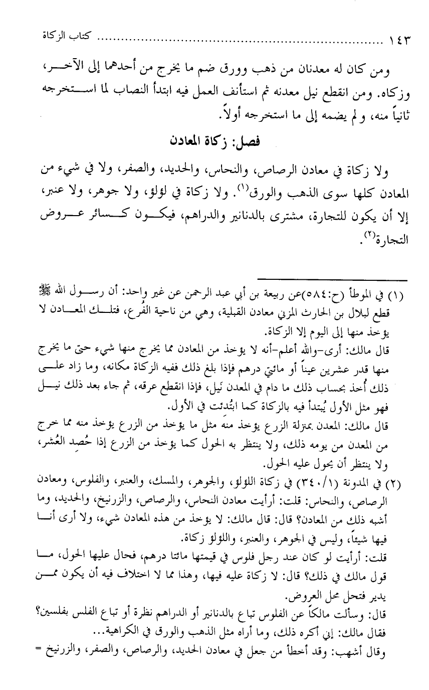 ولا زكاة في معادن الرصاص، والنحاس، والحديد، والصفر، ولا شيئ من المعادن كلها سوى الذهب والورق. ولا زكاة في لؤلؤ، ولا جوهر، ولا عنبر، إلا أن يكون للتجارة، مشترى بالدنانير والدراهم، فيكون كسائر عروض التجارة.