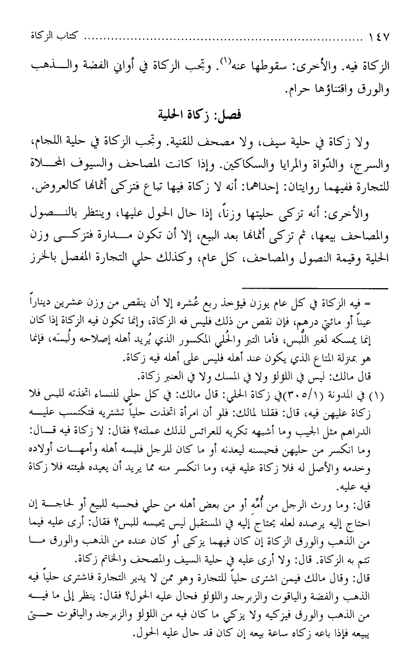 والأخرى: أنه تزكى حليتها وزنًا، إذا حال الحول عليها، وينتظر بالنصول والمصاحف بيعها، ثم تزكى أثمانها بعد البيع، إلا أن تكون مدارة فتزكى وزن الحلية وقيمة النصول والمصاحف، كل عام، وكذلك حلي التجارة المفصل بالخرز