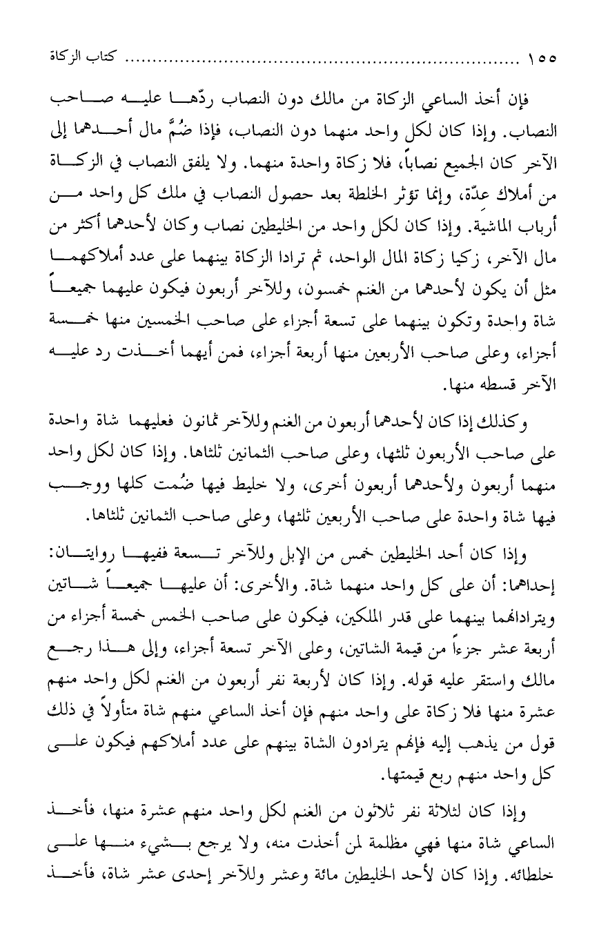 فإذا أخذ الساعي الزكاة من مالك دون النصاب ردّهاً عليه صاحب النصاب. وإذا كان لكل واحد منهما دون النصاب، فإذا ضُمَّ مال أحدهما إلى الآخر كان الجميع نصابًا، فلا زكاة واحدة منهما. ولا يلفق النصاب في الزكاة من أملاك عِدّة، وإنما تؤثر الخلطة بعد حصول النصاب في ملك كل واحد من أرباب الماشية. وإذا كان لكل واحد من الخليطين نصاب وكان لأحدهما أكثر من مال الآخر، زكيا زكاة المال الواحد، ثم ترادا الزكاة بينهما على عدد أملاكهما مثل أن يكون لأحدهما من الغنم خمسون، وللآخر أربعون فيكون عليهما جميعًا شاة واحدة وتكون بينهما على تسعة أجزاء على صاحب الخمسين منها خمسة أجزاء، وعلى صاحب الأربعين منها أربعة أجزاء، فمن أيهما أخذت رد عليه الآخر قسط منها.
