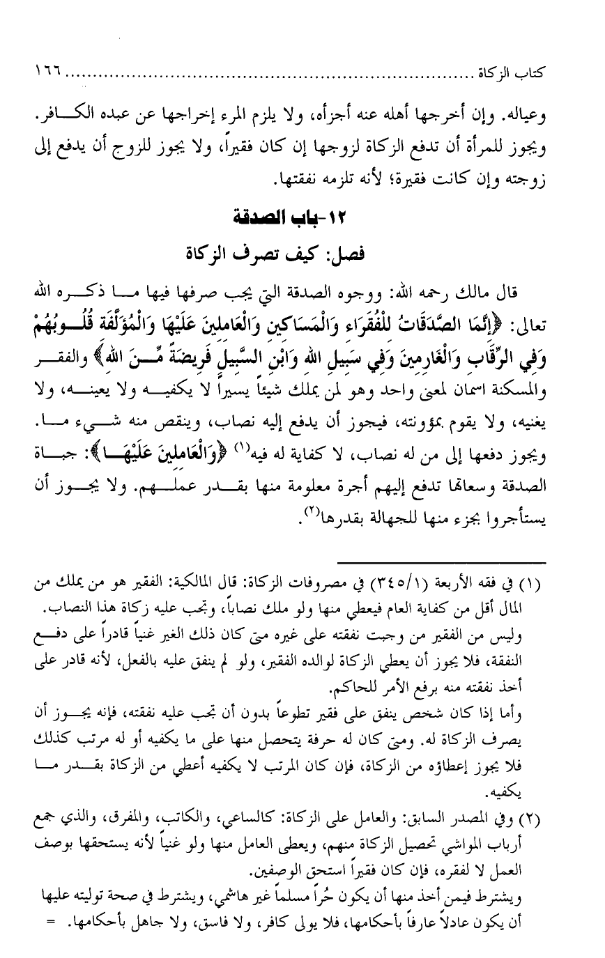 قال مالك رحمه الله: ووجوهالصدقة التي يجب صرفها فيها ما ذكره الله تعالى: (إنما الصدقات للفقراء والمساكين والعاملين عليها والمؤلفة قلوبهم وفي الرقاب والغارمين وفي سبيل الله وابن السبيل فريضة من الله) والفقر والمسكنة اسمان لمعنى واحد وهو لمن يملك شيئًا يسيرًا لا يكفيه ولا يعينه، ولا يغنيه، ولا يقوم بمؤونته، فيجوز أن يدفع إليه نصاب، وينقصمنه شيئ ما. ويجوز دفعها إلى من له نصاب، لا كفاية له فيه (والعاملين عليها): حياة الصدقة وسعاتها تدفع إليهم أجرة معلومة منها بقدر عملهم. ولا يجوز أن يستأجروا بجزء منها للجهالة بقدرها.
