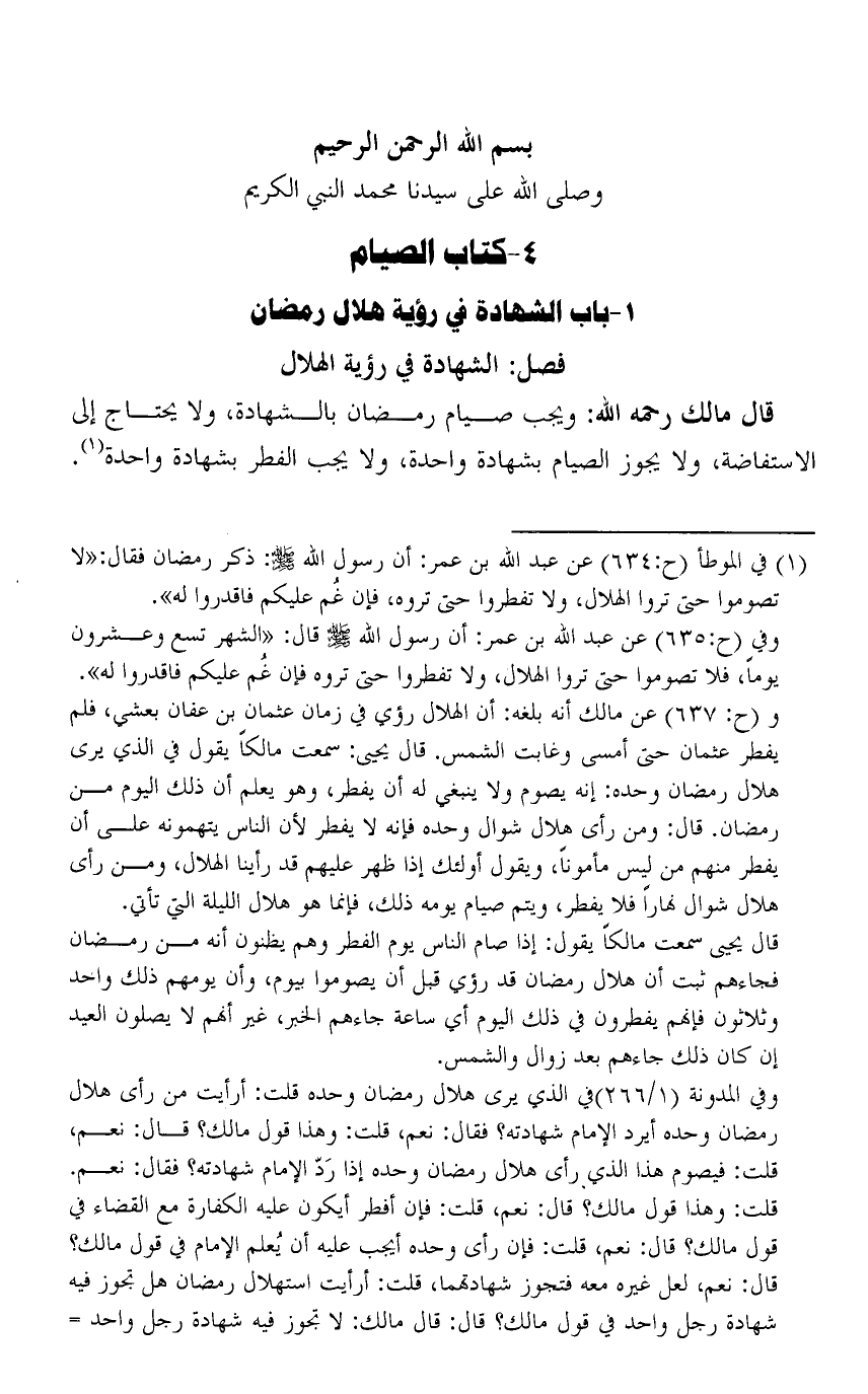 قال مالك رحمه الله: ويجب صيام رمضان بالشهادة، ولا يحتاج إلى الاستفاضة، ولا يجوز الصيام بشهادة واحدة، ولا يجب الفطر بشهادة واحدة.