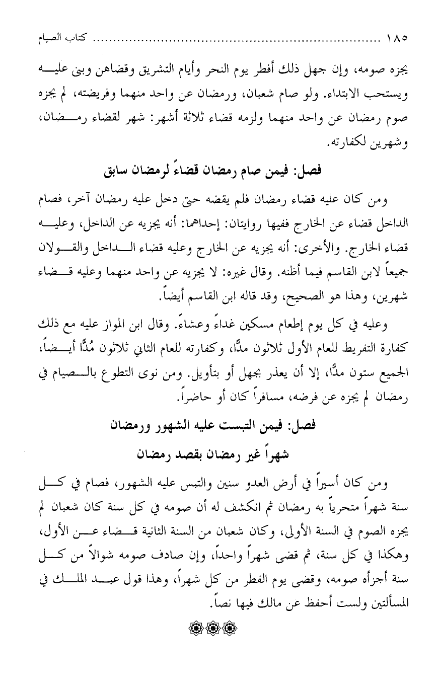 ومن كان أسيرًا في أرض العدو سنين والتبس عليه الشهور، فصام في كل سنة شهرًا متحريًا به رضمان ثم انكشف له أن صومه في كل سنة كان شعبان لم يجزه الصوم في السنة الأولى، وكان شعبان من السنة الثانية قضاء عن الأول، وهكذا في كل سنة، ثم قضى شهرًا واحدًا، وإن صادف صومه شوالاً من كل سنة أجزأه صومه، وقضى يوم الفطر من كل شهرًا، وهذا قو لعبد الملك في المسألتين ولست أحفظ عن مالك فيها نصًا.