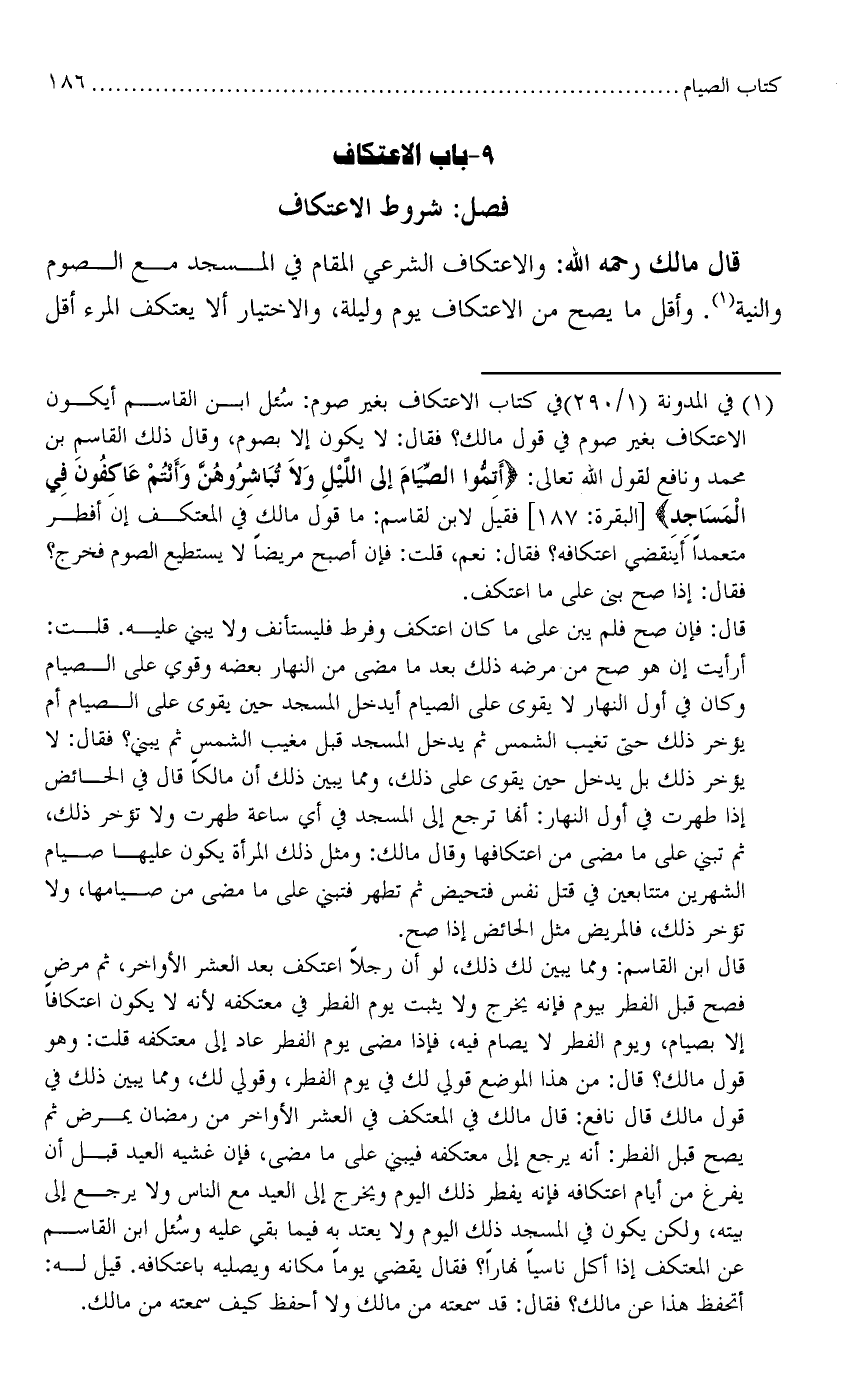 قال مالك رحمه الله: والاعتكاف الشرعي المقام في المسجد مع الصوم والنية. وأقل ما يصح من الاعتكاف يوم وليلة، والاختيار ألا يعتكف المرء أقل