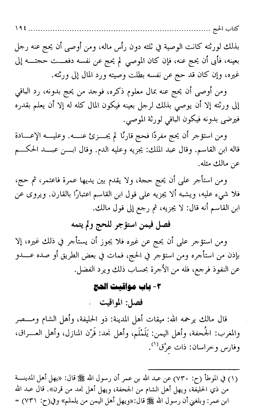 قال مالك يرحمه الله: ميقات أهل المدينة: ذو الحليفة، وأهل الشام ومصر والمغرب: الجحفة، وأهل اليمن: يَلَمْلَم، وأهل نجد: قَرْن المنازل، وأهل العراق، وفارس وخراسان: ذات عِرْق.