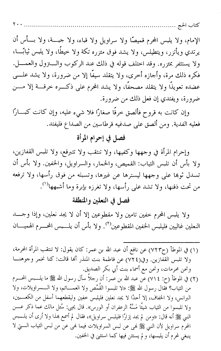 الإمام، ولا يلبس المحرم قميصًا ولا سراويل ولا قباء، ولا جبة، ولا بأس أن يرتدي ويأتزر، ويتطلس، ولا يشد فوق مئزره تكة ولا خيطًا، ولا يلبس ثيابًا، ولا يستثفر بمئزره. وقد اختلف قوله في ذلك عند الركوب والنزول والعمل. فكره ذلك مرة، وأجازه أخرى، ولا يتقلد سيفًا إلا من ضرورة، ولا يشد على عضده تعويذًا ولا يتقلد مصحفًا، ولا يشد المحرم على ذكره خرقة إلا من ضرورة، ويفتدي إن فعل ذلك من ضرورة.