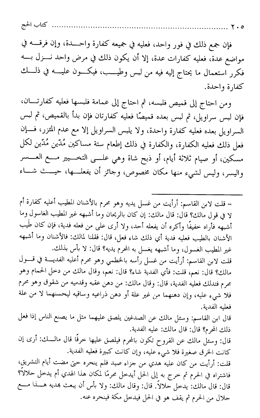 ومن احتاج إلى قميص فلبسه، ثم احتاج إلى عمامة فلبسها فعليه كفارتان، فإن لبس سراويل، ثم لبس بعده قميصًا فعليه كفارتان فإن بدأ بالقميص، ثم لبس السراويل بعده فعليه كفارة واحدة، ولا يلبس السراويل إلا مع عدم المئزر، فإن فعل ذلك فعليه كفارة واحدة، ولا يلبس السراويل إلا مع عدم المئزر، فإن فعل ذلك فعليه الكفارة، والكفارة في ذلك إطعام ستة مساكين مُدّين لكل مسكين، أو صيام ثلاثة أيام، أو ذبح شاة وهي على التخيير مع العسر واليسر، وليس لشيئ منها مكان مخصوص، وجائز أن يفعلها، حيث شاء