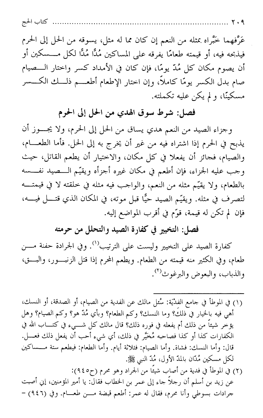 عَرَّفهما خَبَّراه بمثله من النعم إن كان مما له مثل، يسوقه من الحل إلى الحرم فيذبحه فيه، أو قيمته طعامًا يفرقه على المساكين مُدًّا مُدًّا لكل مسكين أو أن يصوم مكانه كل مُدّ يومًا، فإن كان في الأمداد كسر واختار الصيام صام بدل الكسر يومًا كاملاً، وإن اختار الإطعام أطعم ذلك الكسر مسكينًا، ولم يكن عليه تكملته.