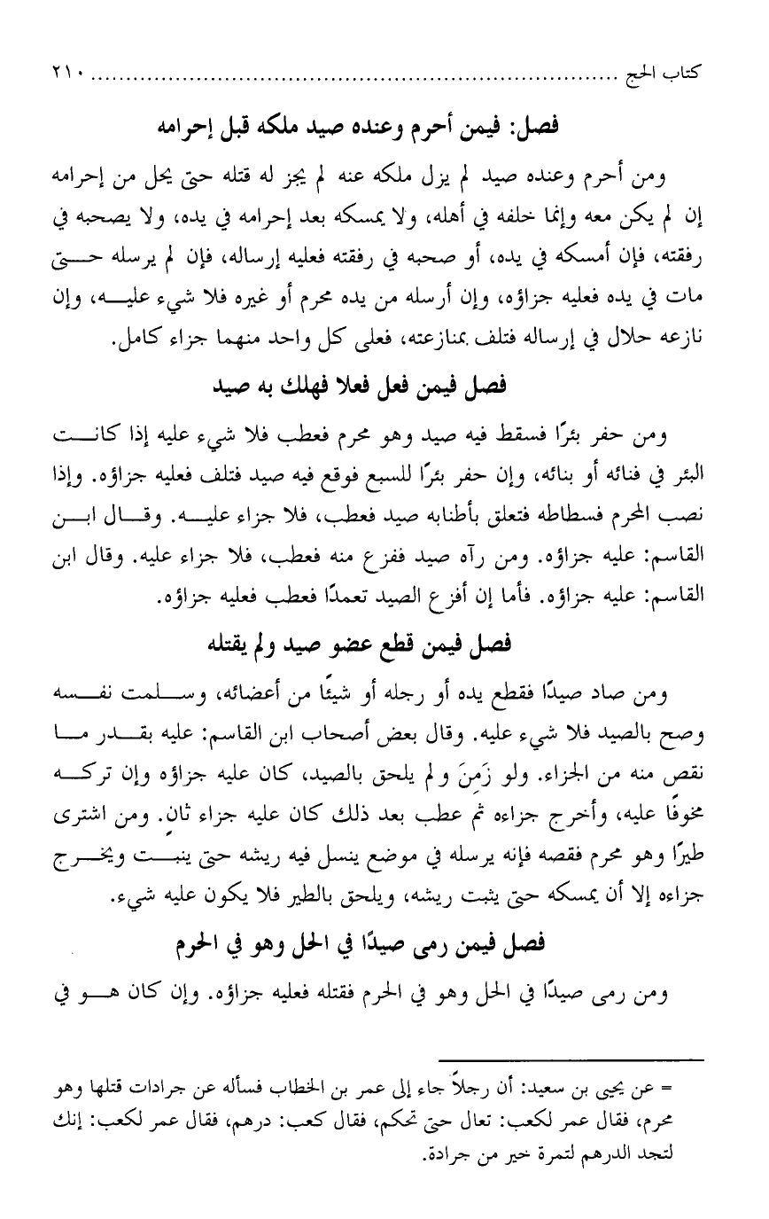 ومن حفر بئرًا فسقط فيه صيد وهو محرم فعطب فلا شيئ عليه إذاكانت البئر في فنائه أو بنائه، وإن حفر بئرًا للسبع فوقع فيه صيد فتلف فعليه جزاؤه. وإذا نصب المحرم فسطاطه فتعلق بأطنابه صيد فعطب، فلا جزاء عليه. وقال ابن القاسم: عليه جزاؤه. ومن رآه صيد ففزع منه فعطب، فلا جزاء عليه. وقال ابن القاسم: عليه جزاؤه. فأما إن أفزع الصيد تعمدًا فعطب فعليه جزاؤه.