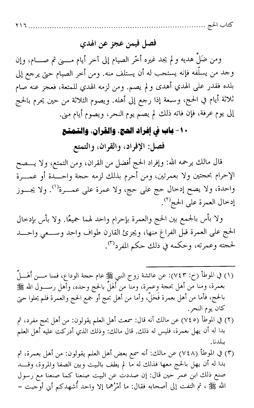 قال مالك يرحمه الله: وإفراد الحج أفضل من القران، ومن التمتع، ولا يصح الإحرام بحجتين ولا بعمرتين، ومن أحرم بذلك لزمه حجة واحدة أو عمرة واحدة، ولا يصح إدخال حج على حج، ولا عمرة على عمرة. ولا يجوز إدخال العمرة على الحج.