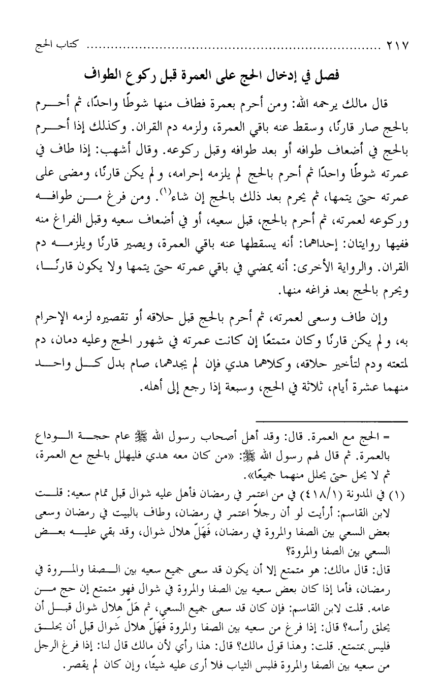 قال مالك يرحمه الله: ومن أحرم بعمرة فطاف منها شوطًا واحدًا، ثم أحرم بالحج صار قارنًا، وسقط عنه باقي العمرة، ولزمه دم القران. وكذلك إذا أحرم بالحج في أضعاف طوافه أو بعد طوافه وقبل ركوعه. وقال أشهب: إذاطاف في عمرته شوطًا واحدًا ثم أحرم بالحج لم يلزمه إحرامه، ولم يكن قارنًا، ومضى على عمرته حتى يتمها، ثم يحرم بعد ذلك بالحج إن شاء. ومن فرغ من طوافه وركوعه لعمرته، ثم أحرم بالحج، قبل سعيه، أو في أضشعاف سعيه وقبل الفراغ منه ففيها روايتان: إحداهما: أنه يسقطها عنه باقي العمرة، ويصير قارنًا ويلزمه دم القران. والرواية الأخرى: أنه يمضي في باقي عمرته حتى يتمها ولا يكون قارنًا، ويحرم بالحج بعد فراغه منها.