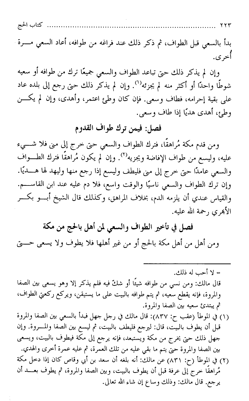 ومن قدم مكة مُراهقًا، فترك الطواف والسعي حتى خرج إلى منى فلا شيئ عليه، وليسع من طواف الإفاضة ويجزيه. وإن لم يكون مُراهقًا فترك الطواف والسعي عامدًا حتى خرج إلى منى فليطف وليسع إذا رجع منها وليهد لها هديًا. وإن ترك الطواف والسعي ناسيًا والوقت واسع، فلا دم علهي عند ابن القاسم. والقياس عندي أن يلزمه الدم، بخلاف المراهق، وكذلك قال الشيخ أبو بكر الأبهري رحمة الله عليه.