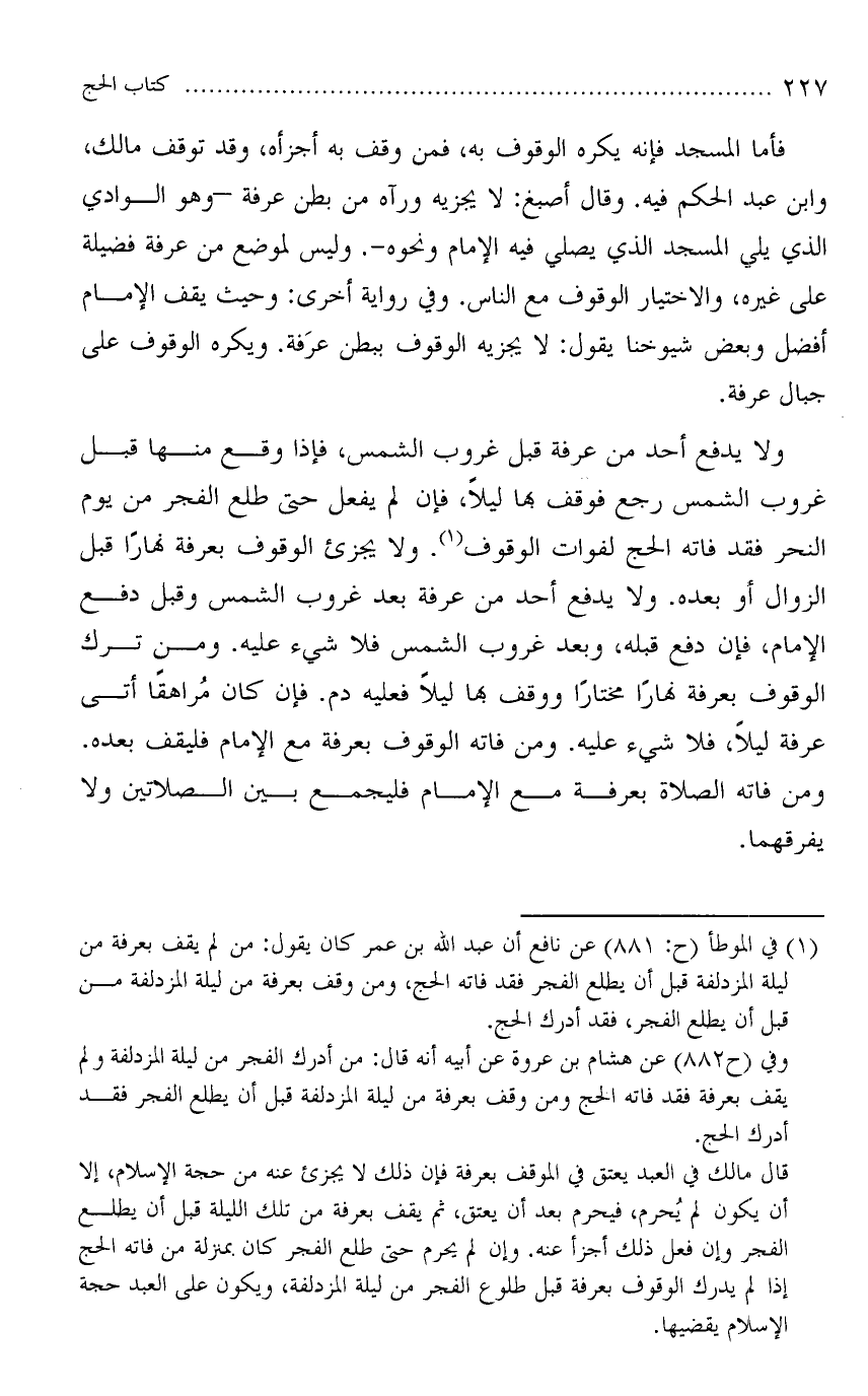 ولا يدفع أحد من عرفة قبل غروب الشمس، فإذا وقع منها قيل غروب الشمس رجع فوقف بها ليلاً، فإن لم يفعل حتى طلع الفجر من يوم النحر فقد فاته الحج لفوات الوقوف. ولا يجزئ الوقوف بعرفة نهارًا قبل الزوال أو بعده. ولا يدفع أحد من عرفة بعد غروب الشمس وقبل دفع الإمام، فإن دفع قبله، وبعد غروب الشمس فلا شيئ عليه. ومن ترك الوقوف بعرفة نهارًا مختارًا ووقف بها ليلاً فعليه دم. فإن كان مُراهقًا أتى عرفة ليلاً، فلا شيئ عليه. ومن فاته الوقوف بعرفة مع اإمام فليقف بعده. ومن فاته الصلاة بعرفة مع الإمام فليجمع بين الصلاتين ولا يفرقهما.