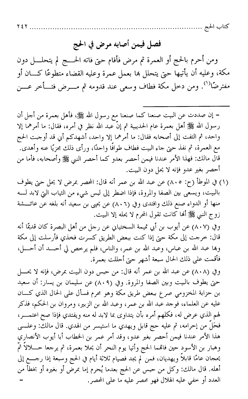 ومن أحرم بالحج أو العمرة ثم مرض فأقام حتى فاته الحج لم يتحلل دون مكة، وعليه أن يأتيها حتى يتحلل بها بعمل عمرة وعليه القضاء متطوعًا كان أو مفترضًا. ومن دخل فطاف وسعى عند قدومه ثم مرض فتأخر عن