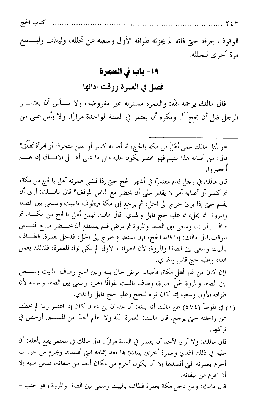 قال مالك يرحمه الله: والعمرة مسنونة غير مفروضة، ولا بأس أن يعتمر الرجل قبل أن يحج. ويكره أن يعتمر في السنة الواحدة مرارًا. ولا بأس على من