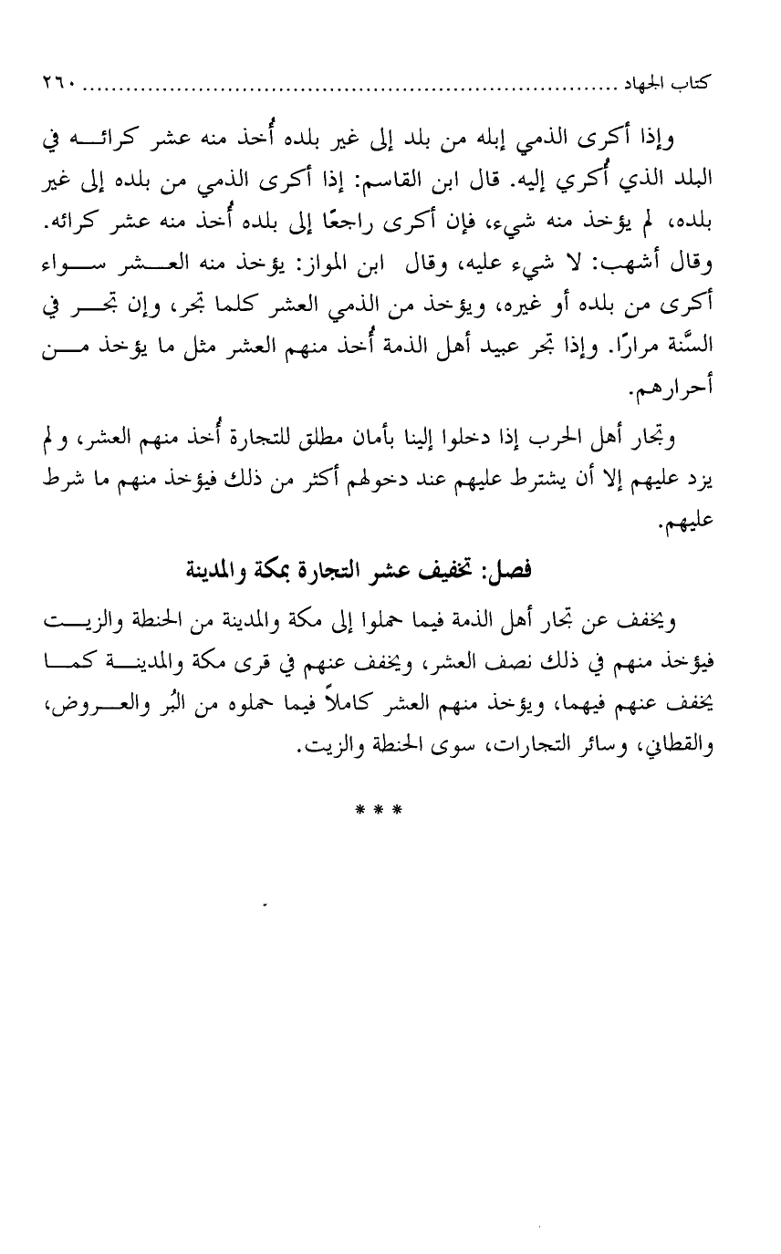 ويخفف عن تجار أهل الذمة فيما حملوا إلى مكة والمدينة من الحنطة والزيت فيؤخذ منهم في ذلك نصف العُشر، ويخفف عنهم في قرى مكة والمدينة كما يُخفف عنهم فيهما، ويؤخذ منهم العُشر كاملاً فيما حلموه من البُر والعروض، والقطاني، وسائر التجارات، سوى الحنطة والزيت.