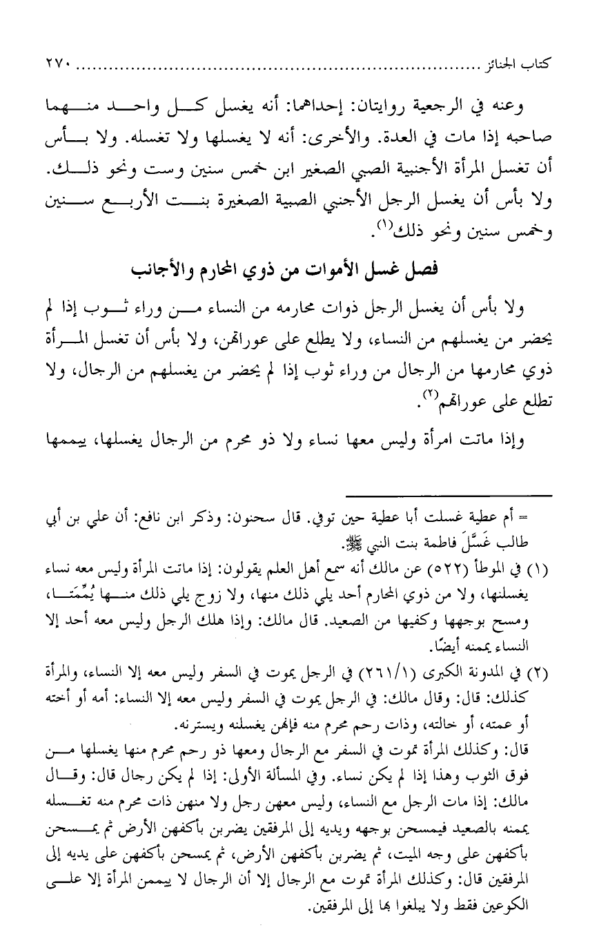 ولا بأس أن يغسل الرجل ذوات محارمه من النساء من وراء ثوب إذا لم يحضر من يغسلهم من النساء، ولا يطلع على عوراتهن، ولا بأس أن تغسل المرأة ذوي محارمها من الرجال من وراء ثوب إذا لم يحضر من يغسلهم من الرجال، ولا تطلع على عوراتهم.