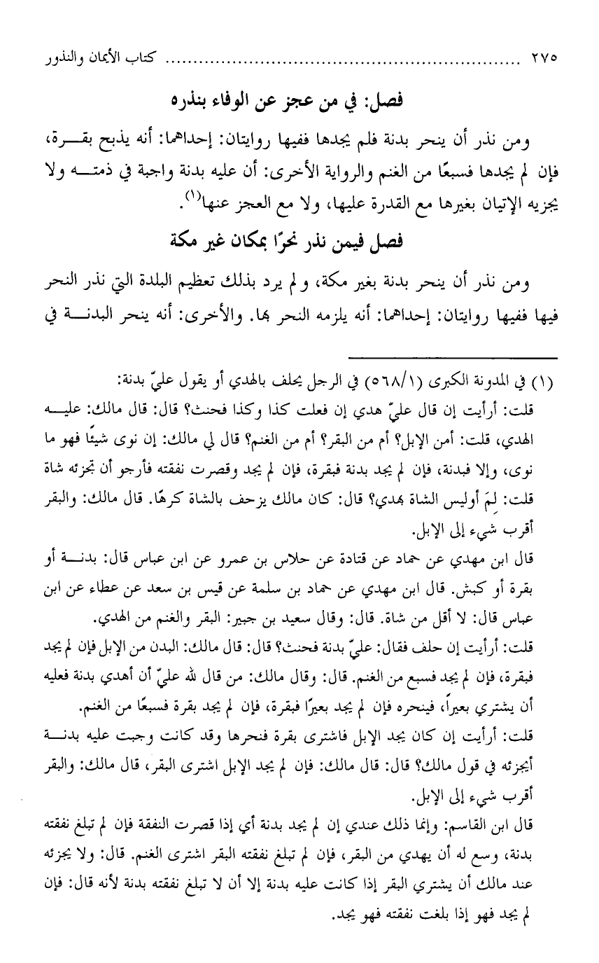 ومن نذر أن ينحر بدنة فلم يجدها ففيها روايتان: إحداهما: أنه يذبح بقرة، فإن لم يجدها فسبعًا من الغنم والرواية الأخرى: أن عليه بدنة واجبة في ذمته ولا يجزيه الإتيان بغيرها مع القدرة عليها، ولا مع العجز عنها.