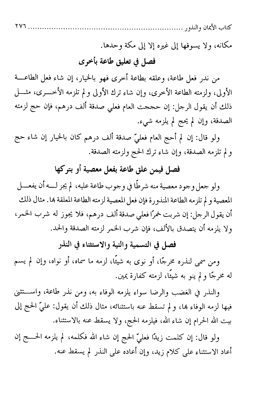 من نذر فعل طاعة، وعلقه بطاعة أخرى فهو بالخيار، إن شاء فعل الطاعة الأولى، ولزمته الطاعة الأخرى، وإن شاء ترك الأولى ولم تلزمه الأخرى، مثل ذلك أن يقول الرجل: إن حججت العام فعلي صدقة ألف درهم، فإ، حج لزمته الصدقة، وإن لم يحج لم يلزمه شيئ.