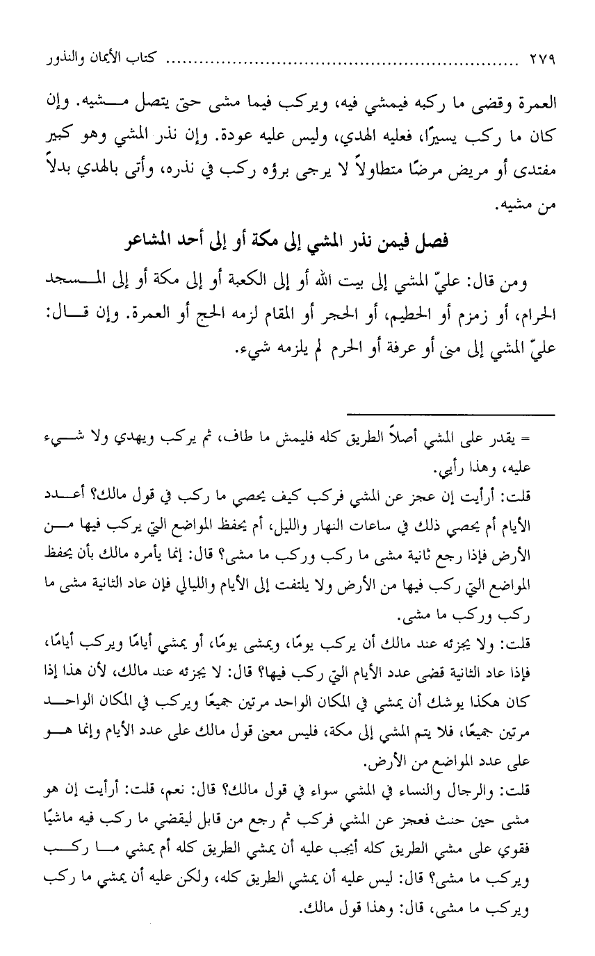 العمرة وقضى ما ركبه فيمشي فيه، ويركب فيما مشى حتى يتصل مشيه. وإن كان ما ركب يسيرًا، فعليه الهدي، وليس عليه عودة. وإن نذر المشي وهو كبير مفتدى أو مريض مرضًا متطاولاً لا يرجى برؤه ركب في نذره، وأتى بالهدي بدلاً من مشيه.