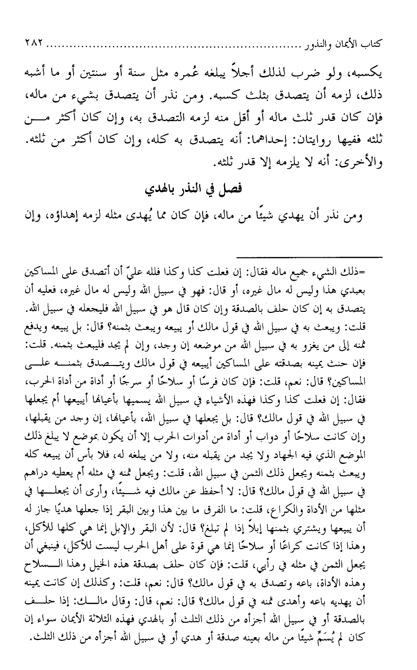 يكسبه، ولو ضرب أجلاص يبلغه عُمره مثل سنة أو سنتين أو ما أشبه ذلك، لزمه أن يتصدق بثلث كسبه. ومن نذر أن يتصدق بشيئ من ماله، فغ، كان قدر ثلث ماله أو أقل منه لزمه التصدق به، وإن كان أكثر من ثلثه ففيها روايتان: إحداهما: أنه يتصدق به كله، وإن كان أكثر من ثلثه والأخرى: أنه لا يلزمه إلا قدر ثلثه.