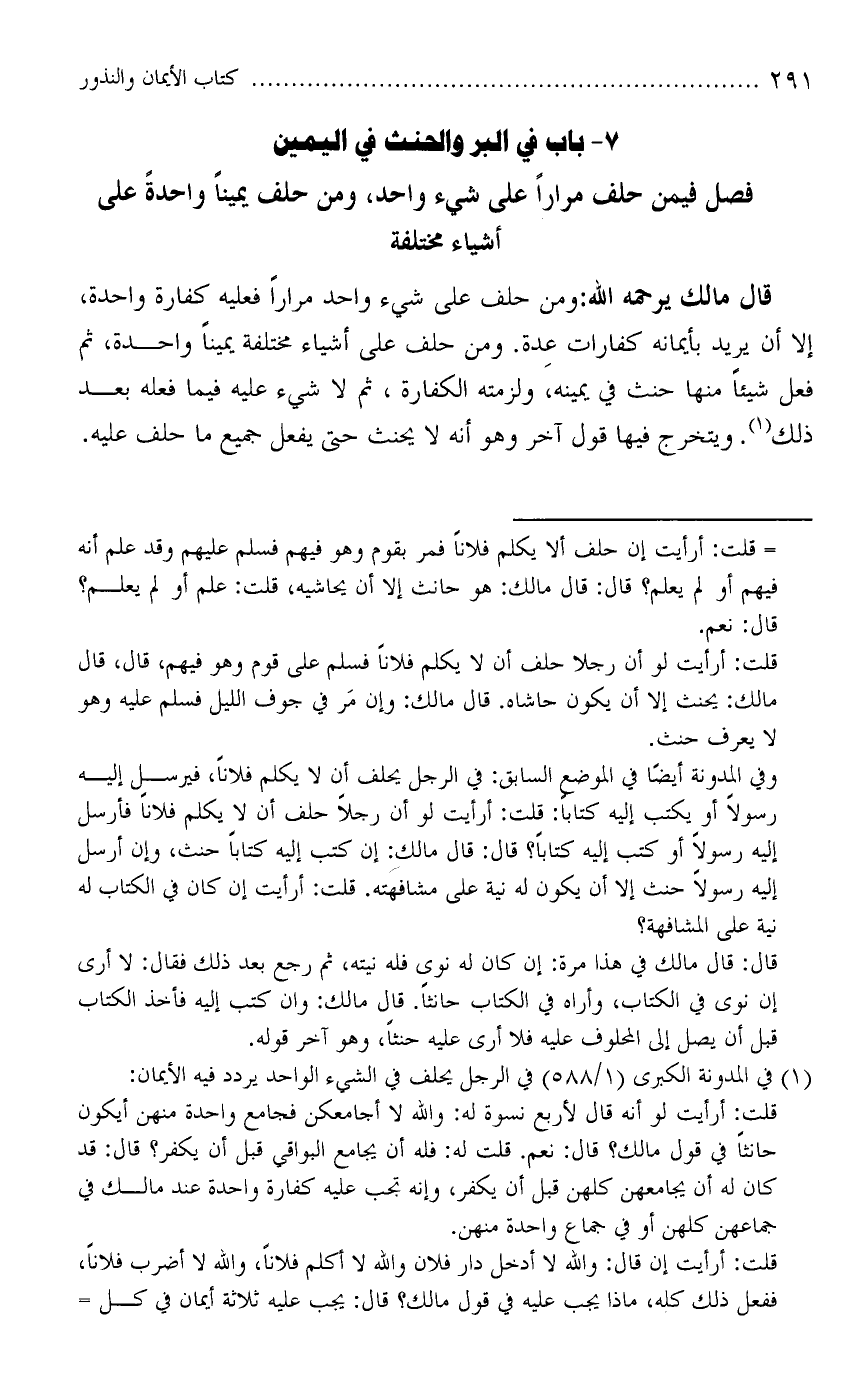 قال مالك يرحمه الله: ومن حلف على شيئ واحد مرارًا فعليه كفارة واحدة، إلا أن يريد بايمانه كفارات عدة. ومن حلف على أشياء مختلفة يمينًا واحدة، ثم فعل شيئًا منها حنث في يمينه، ولزمته الكفارة، ثم لا شيئ عليه فيما فعله بعد ذلك. ويتخرج فيها قول آخر وهو أنه لا يحنث حتى يفعل جميع ما حلف عليه.