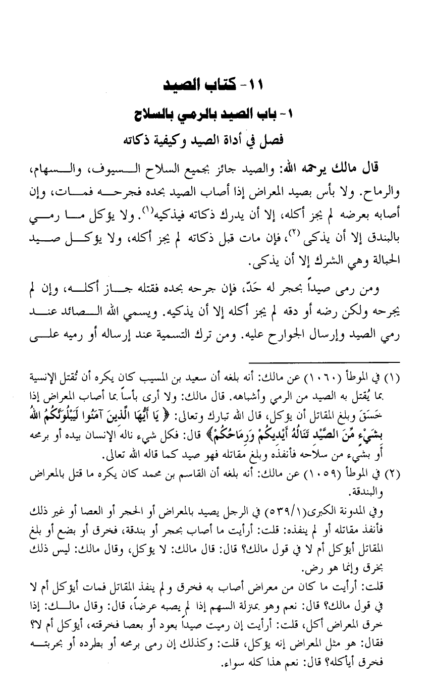 قال مالك يرحمه الله: والصيد جائز بجميع السلاح السيوف، والسهام، والرماح. ولا بأس بصيد لمعراض إذا أصاب الصيد بحده فجرحه فمات، وإن أصابه بعرضه لم يجز أكله، إلا أن يدرك ذكاته فيذكيه. ولا يؤكل ما رمى بالبندق إلا أن يذكى، فغ، مات قبل ذكاته لم يجز أكله، ولا يؤكل صيد الحبالة وهي الشرك إلا أن يذكى.
