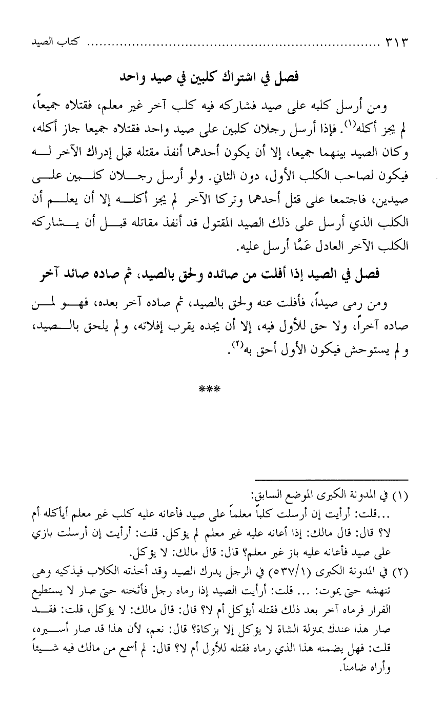 ومن أرسل كلبه على صيد فشاركه فيه كلب آخر غير معلم، فقتلاه جميعًا، لم يجز أكله. فإذا أرسل رجلان كلبين على صيد واحد فقتلاه جميعًا جاز أكله، وكان الصيد بينهما جميعًا، إل أن يكون أحدهما أنفذ مقتله قبل إدراك الآخر له فيكون لصاحب الكلب الأول، دون الثاني. ولو أرسل رجلان كلبين على صيدين، فاجتمعا على قتل أحدهما وتركا الآخر لم يجز أكله إلا أن يعلم أن الكلب الذي أرسل على ذلك الصيد المقتول قد أنفذ مقاتله قبل أن يشاركه الكلب الآخر العادل عَمَّا أرسل عليه.