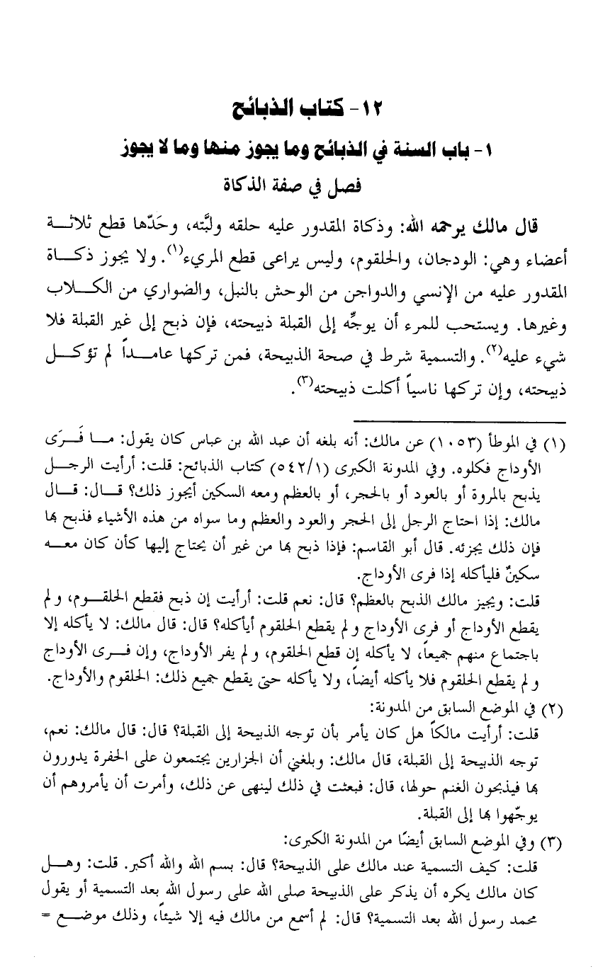 قال مالك يرحمه الله: وذكاة المقدور عليه حلقه ولبَّته، وحدها قطع ثلاثة أعضاء وهي: الودجان، والحلقوم، وليس يراعى قطع المرئ. ولا يجوز ذكاة المقدور عليه من الإنسي والدواجن من الوحش بالنبل، والضواري من الكلاب وغيرها. ويستحخب للمرء أن يوجه إلى القبلة ذبيحته، فإن ذبح إلى غير القبلة فلا شيئ عليه. والتسمية شرط في صحة الذبيحة، فمن تركها عامدًا لم تؤكل ذبيحته، وإنتركها ناسيًا أكلت ذبيحته.
