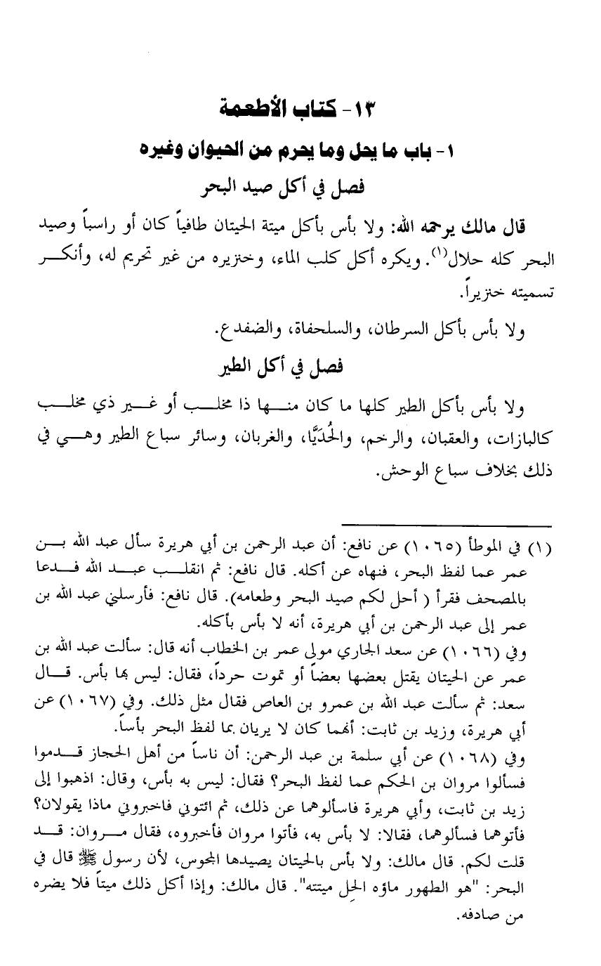 قال مالك يرحمه الله: ولا بأس بأكل ميتة الحيتان طافيًا كان أو راسبًا وصيد البحر كله حلال. ويكره أكل كلب الماء، وخنزيره من غير تحريم له، وانكسر تسميته خنزيرًا.