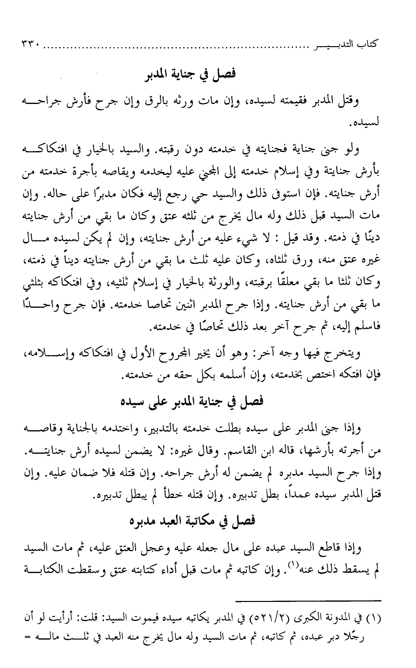 ولو جنى جناية فجنايته في خدمته دون رقبته. والسيد بالخيار في افتكاكه بأرش جناية وفي إسلام خدمته إلى المجني عليه ليخدمه ويقاصه بأجرة خدمته من أرش جنايته. فإن استوفى ذلك والسيد حي رجع إلىيه فكان مدبرًا على حاله. وإن مات السيد قبل ذلك وله مال يخرج من ثلثه عتق وكان ما بقي من أرش جنايته دينًا في ذمته. وقد قيل: لا شيئ عليه ثلث ما بقي من أرش جنايته دينًا في ذمته، وكان ثلثًا ما بقي معلقًا برقبته، والورثة بالخيار في إسلام ثلثيه، وفي افتكاكه بثلثي ما بقي من أرش جنايته. وإذا جرح المدبر اثنين تحاصا خدمته. فإن جرح واحدًا فأسلم إليه، ثم جرح آخر بعد ذلك تحاصا في خدمته.
