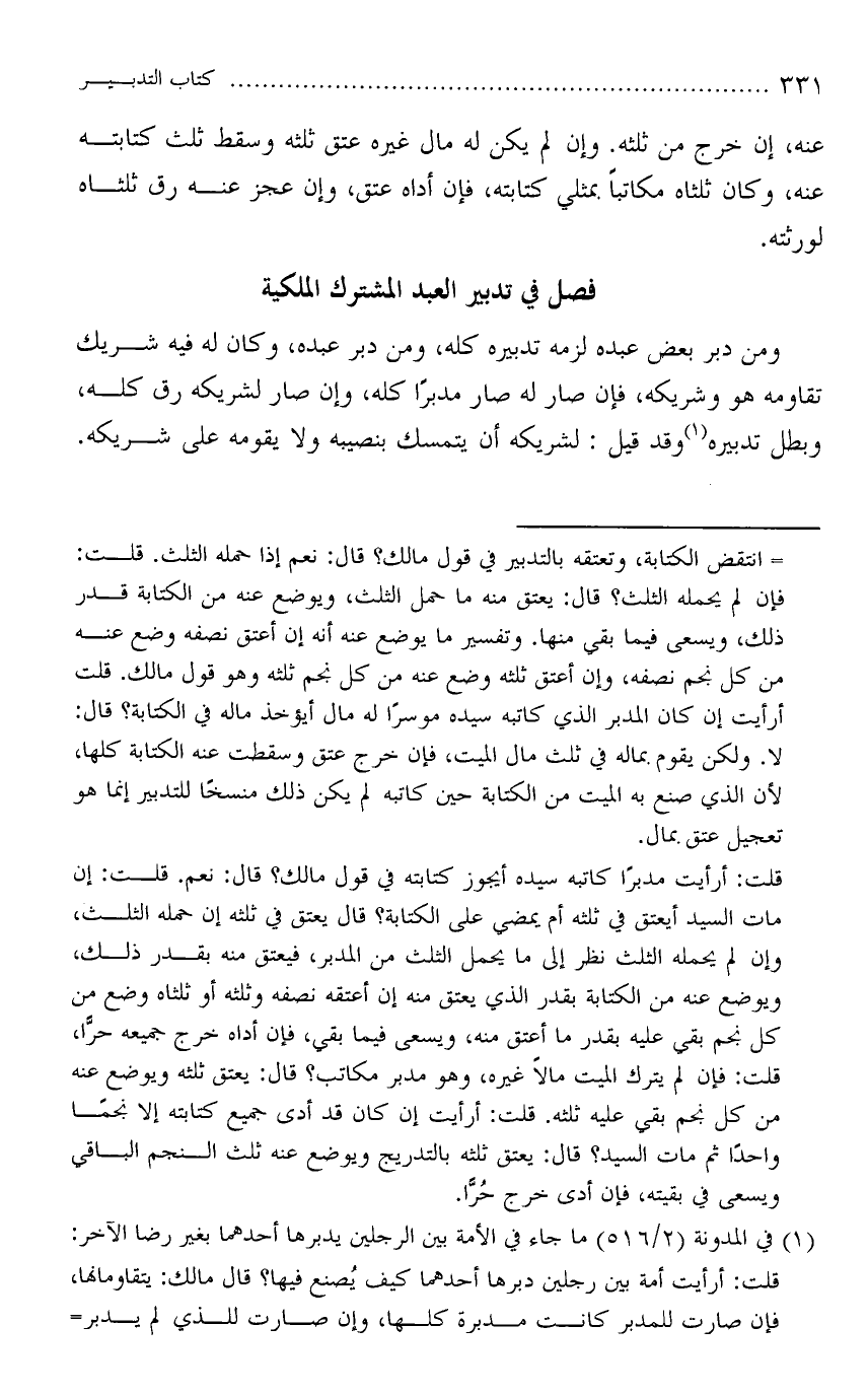 ومن دبر بعض عبده لزمه تدبيره، كله ومن دبر عبده، وكان له فيه شريك تقاومه هو وشريكه، فإن صار له صار مدبرًا كله، وإن صار لشريكه رق كله، وبطل تدبير وقد قيل: لشريكه أن يتمسك بنصيبه ولا يقومه على شريكة.
