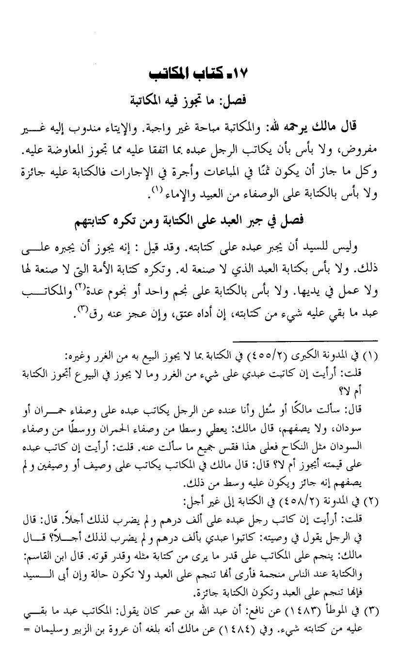 قال مالك يرحمه الله: والمكاتبة مباحة غير واجبة. والإيتاء مندوب إليه غير مفروض، ولا بأس بأن يكاتب الرجل عبده بما اتفقا عليه مما تجوز المعاوضة عليه. وكل ما جاز أن يكون ثمنًا في المباعات وأجرة في الإجارات فالكتابة عليه جائزة ولا بأس بالكتابة على الوصفاء من العبيد والإماء.