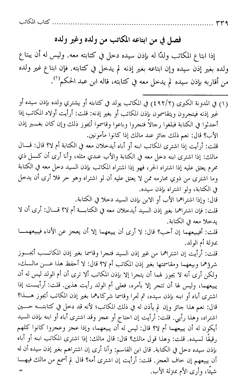 إذا ابتاع المكاتب ولدًا له بإذن سيده دخل في كتابته معه. وليس له أن يبتاع ولده بغير إذن سيده وإن ابتاعه بغير إذنه لم يدخل في كتابته. فإن ابتاع غير ولده من أقاربه بإذن سيده لم يدخل معه في كتابته، قال ابن عبد الحكم.