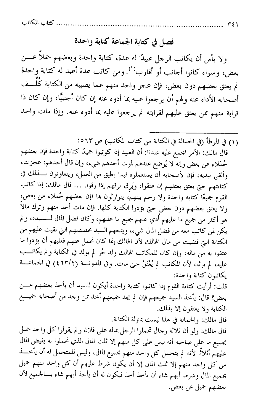 ولا بأس أن يكاتب الرجل عبيدًا له عدة، كتابة واحدة وبعضهم حملاً عن بعض، وسواء كانوا أجانب أو أقارب. ومن كاتب عدة أعبد له كتابة واحدة لم يعتق بعضهم دون بضع، فإن عجز واحد منهم عما يصيبه من الكتاب كُلَّف أصحابه الأداء عنه ولهم أن يرجعوا عليه بما أوده عنه إن كان اجنبيًّا، وإن كا ذا قرابة منهم ممن يعتق عليهم لقرابته لم يرجعوا عليه بما أدوه عنه. وإذامات واحد