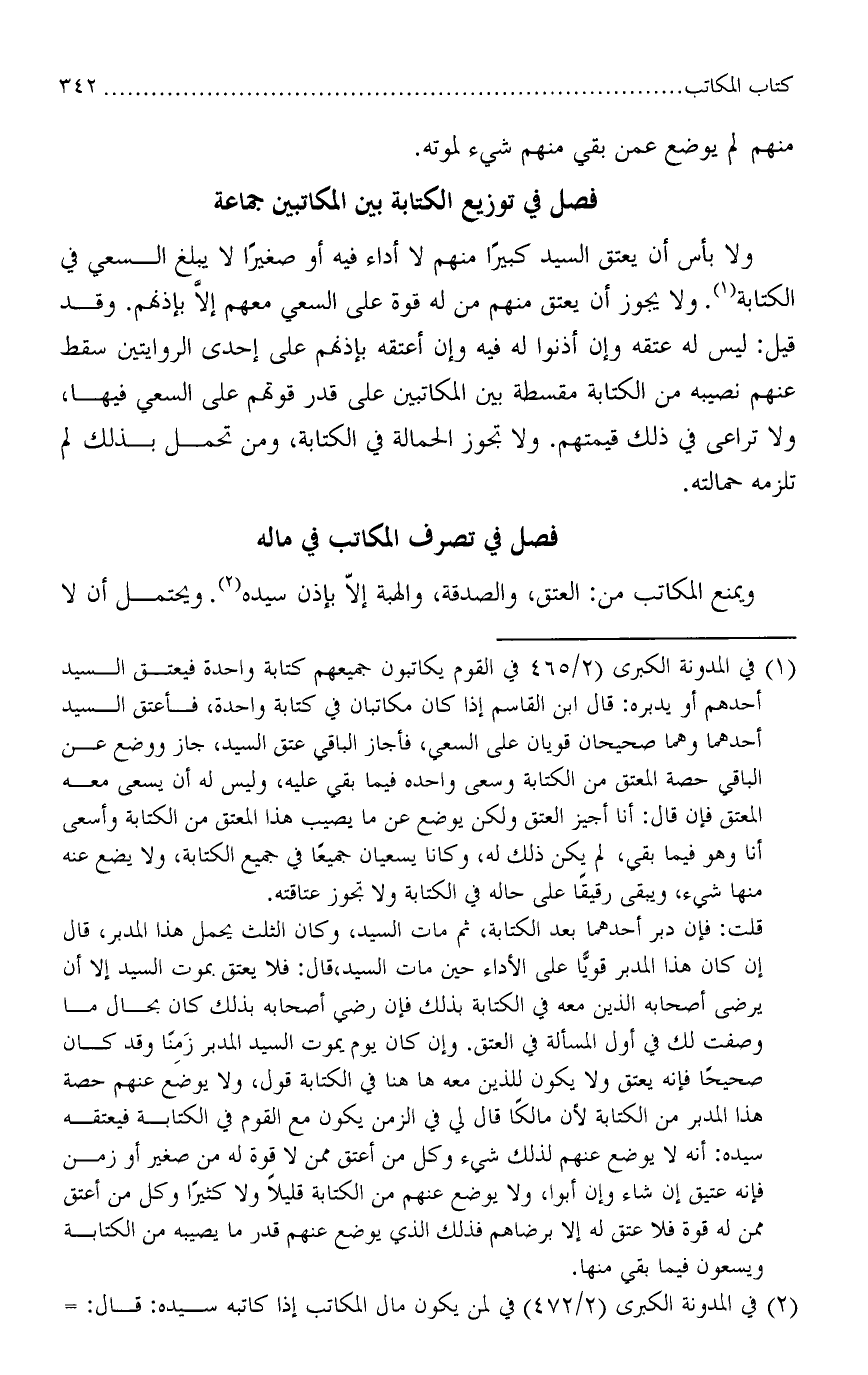 ولا بأس أن يعتق السيد كبيرًا منهم لا أداء فيه أو صغيرًا لا يبلغ السعي في الكتابة. ولا يجوز أن يعتق منهم من له قوة علىالسعي معهم إلاَّ بإذنهم. وقد قيل: ليس له عتقه وإن أذنوا له فيه وإن أعتقه بإذنهم على إحدى الروايتين سقط عنهم نصيبه من الكتابة مقسطة بين المكاتبين على قدر قوتهم على السعي يها، ولا تراعي في ذلك قيمتهم. ولا تجوز الحمالة في الكتابة، ومن تحمل بذلك لم تلزمه حمالته.