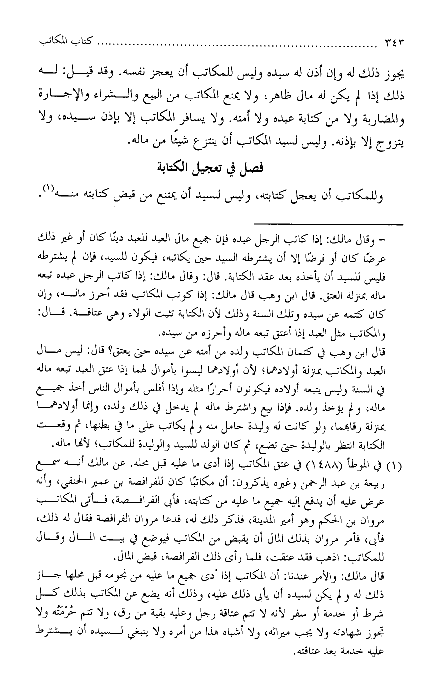 يجوز ذلك له وإن أذن له سيده وليس للمكاتب أن يعجز نفسه. وقد قيل: له ذلك إذا لم يكن له مال ظاهر، ولا يمنع المكاتب من البيع والشراء والإجارة والمضاربة ولا من كتابة عبده ولا أمته. ولا يسافر المكاتب إلا بإذن سيده، ولا يتزوج إلا بإذنه. وليس لسيد المكاتب أن ينتزع شيئًا من ماله.