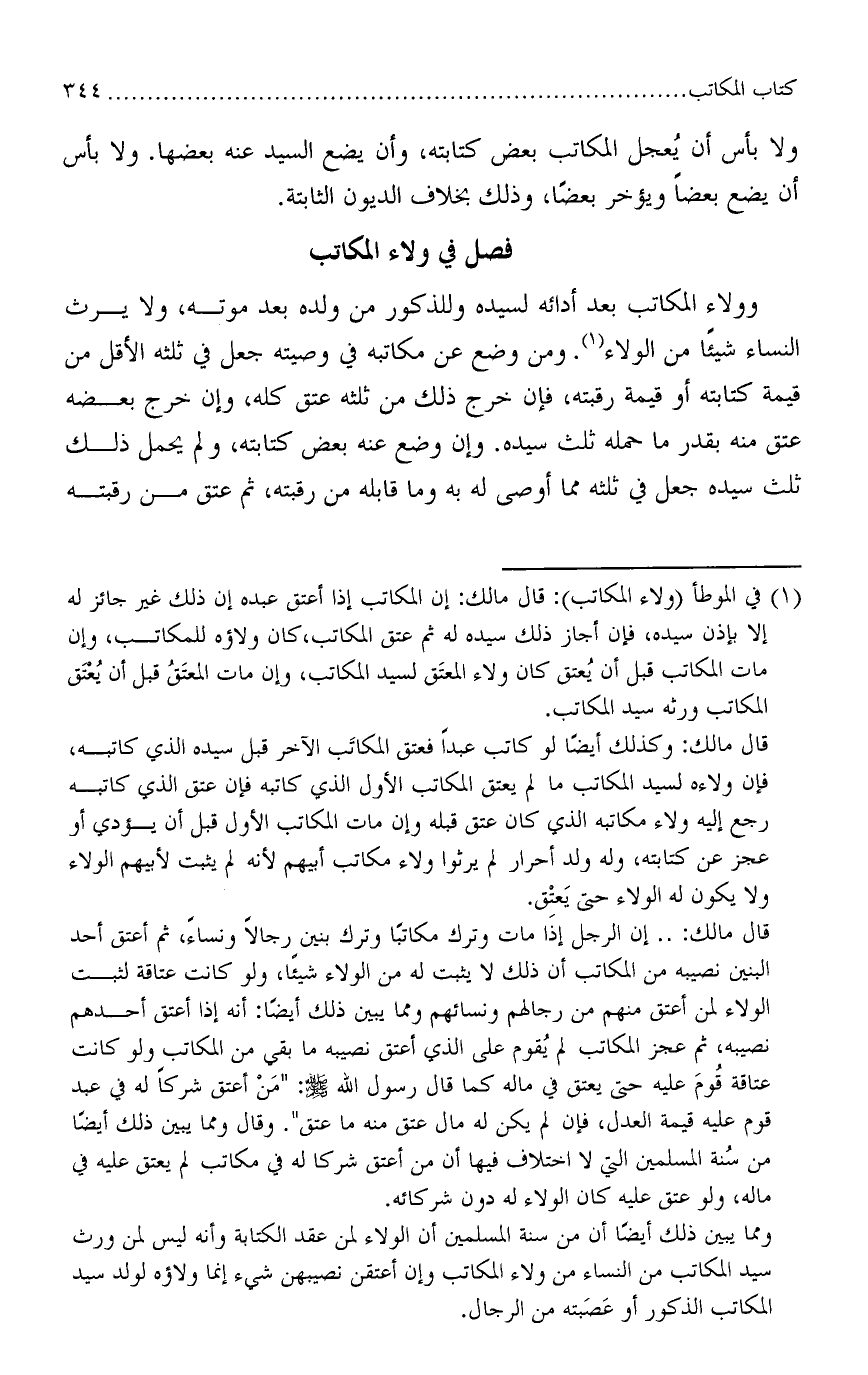 وولاء المكاتب بعد أدائه لسيده وولذكور من ولده بعد موته، وال يرث النساء شيئًا من الولاء. ومن وضع عن مكاتبه في وصيته جعل في ثلثه الأقل من قيمة كتابته أو قيمة رقبته، فإن خرج ذلك من ثلثه عتق كله، وإن خرج بعضه عتق منه بقدر ما حمله ثلث سيده. وإن وضع عنه بعض كتابته، ولم يحمل ذلك ثلث سيده جعل في ثلثه مما أوصى له به وما قابله من رقبته، ثم عتق من رقبته
