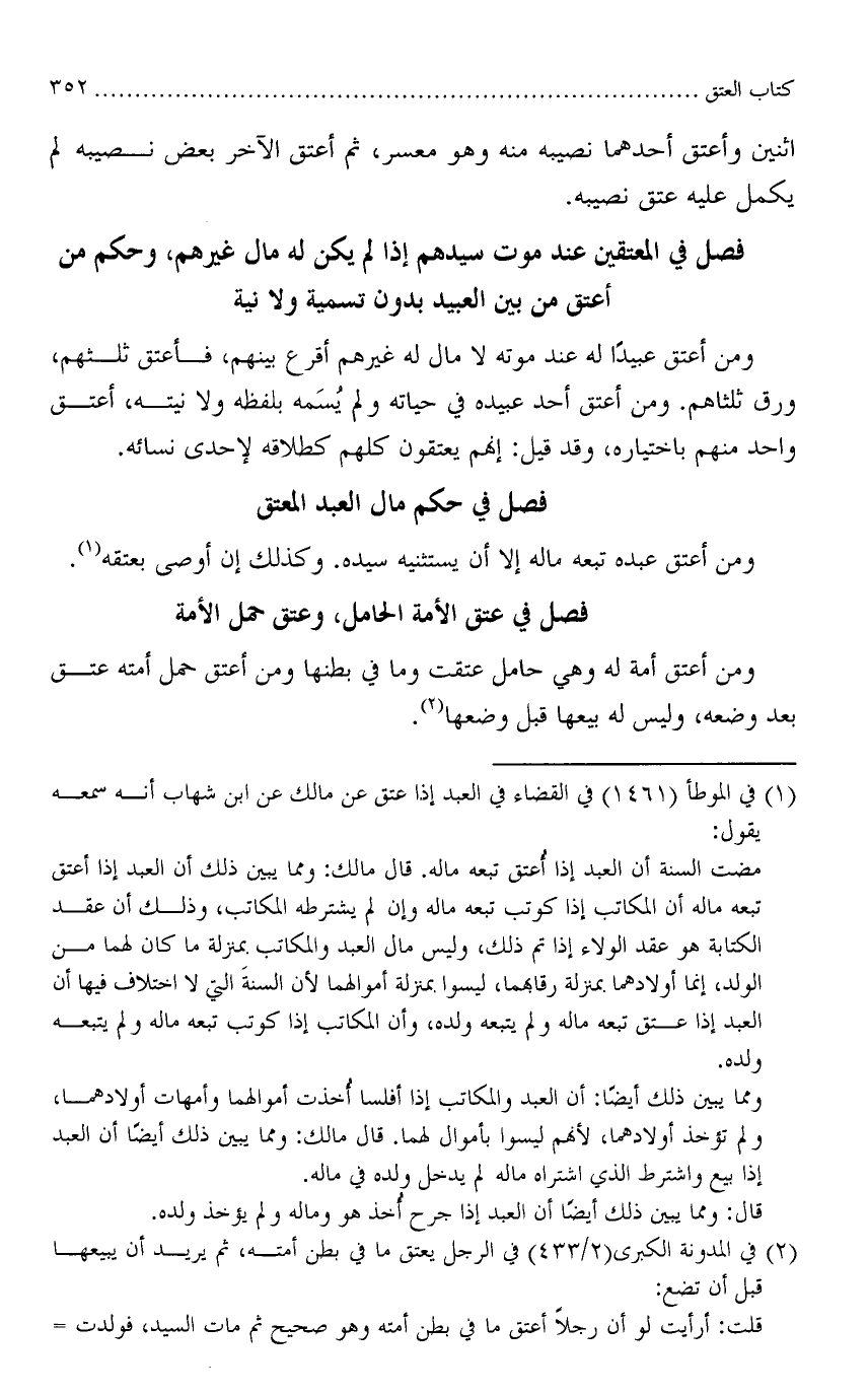 ومن أعتق عبيدًا له عند موته لا مال له غيرهم أقرع بينهم، فأعتق ثلثهم، ورق ثلثاهم. ومن أعتق أحد عبيده في حياته ولم يُسَمه بلفظه ولا نيته، أعتق واحد منهم باختياره، وقدقيل: إنهم يعتقون كلهم كطلاقة لإحدى نسائه.