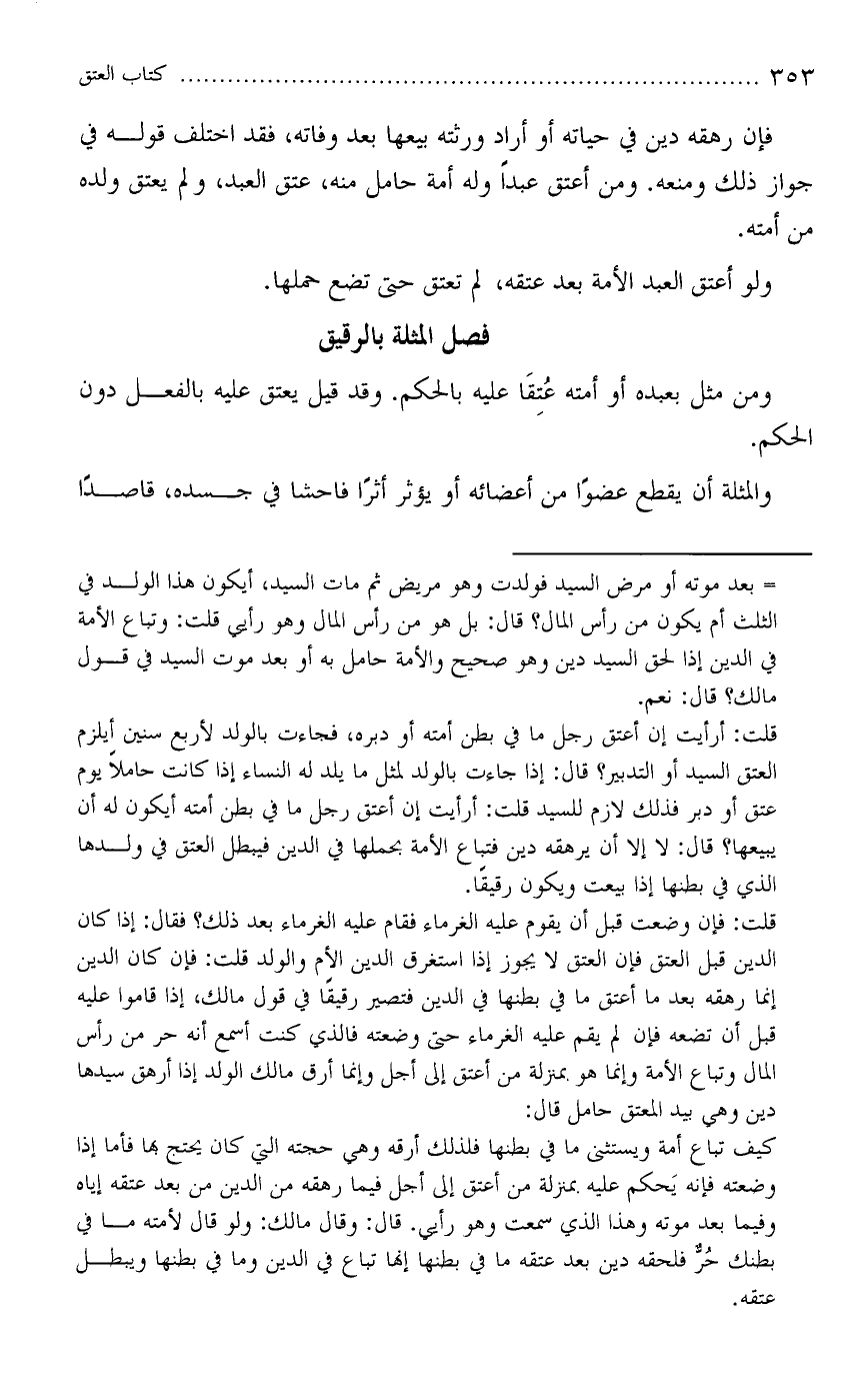 فإن رهقه دين في حياته أو أراد ورثته بيعها بعدوفاته، فقد اختلف قوله في جواز ذلك ومنعه. ومن أعتق عبدًا وله أمة حامل منه، عتق العبد، ولم يعتق ولده من أمته.