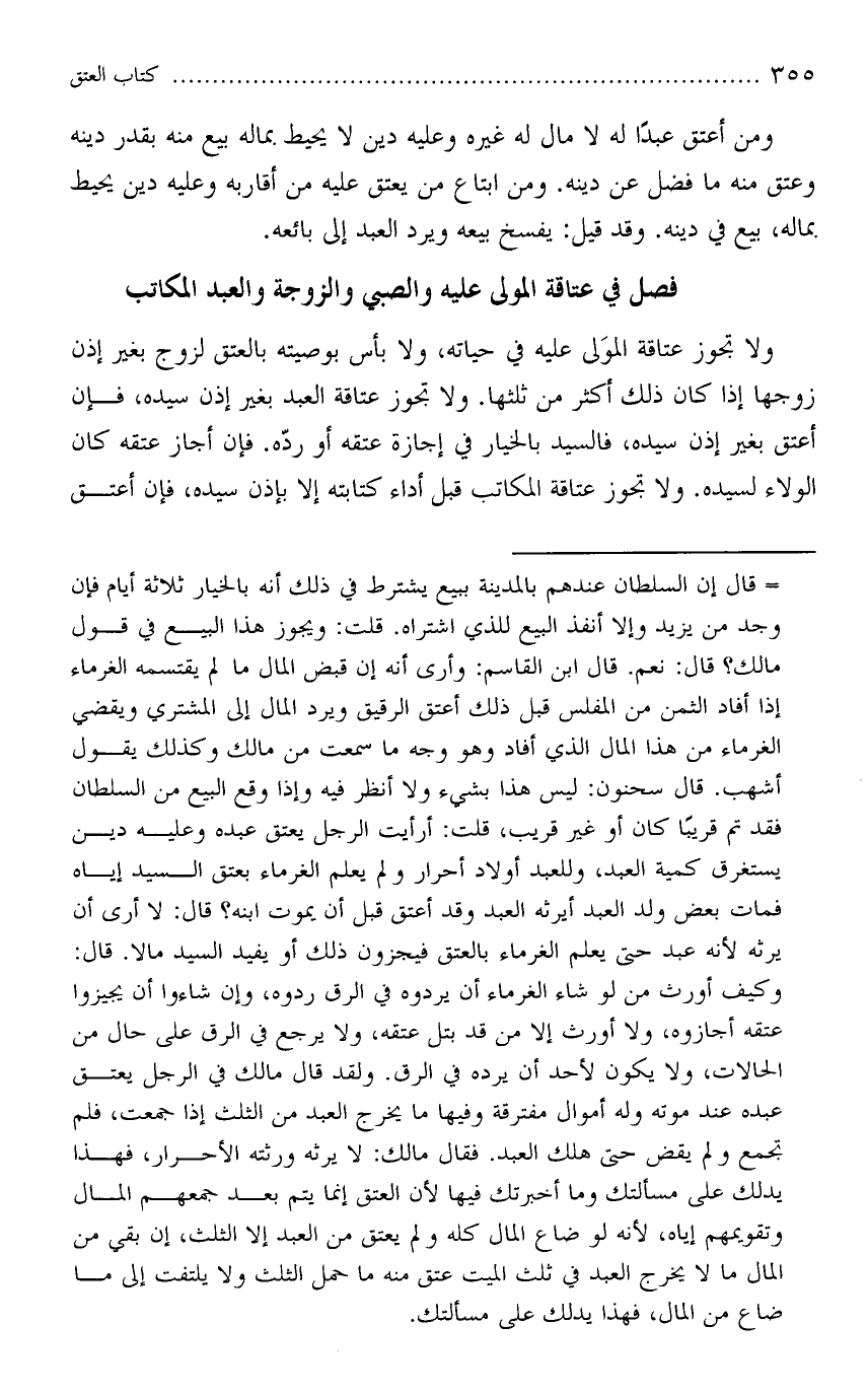 ومن أعتق عبدًا له لا مال له غيره وعليه دين لا يحيط بماله بيع منه بقدر دينه وعتق منه ما فضل عن دينه. ومن ابتاع من يعتق عليه منأقاربه وعليه دين يحيط بماله، بيع في دينه. وقد قيل: يفسخ بيعه ويرد العبد إلى بائعه.
