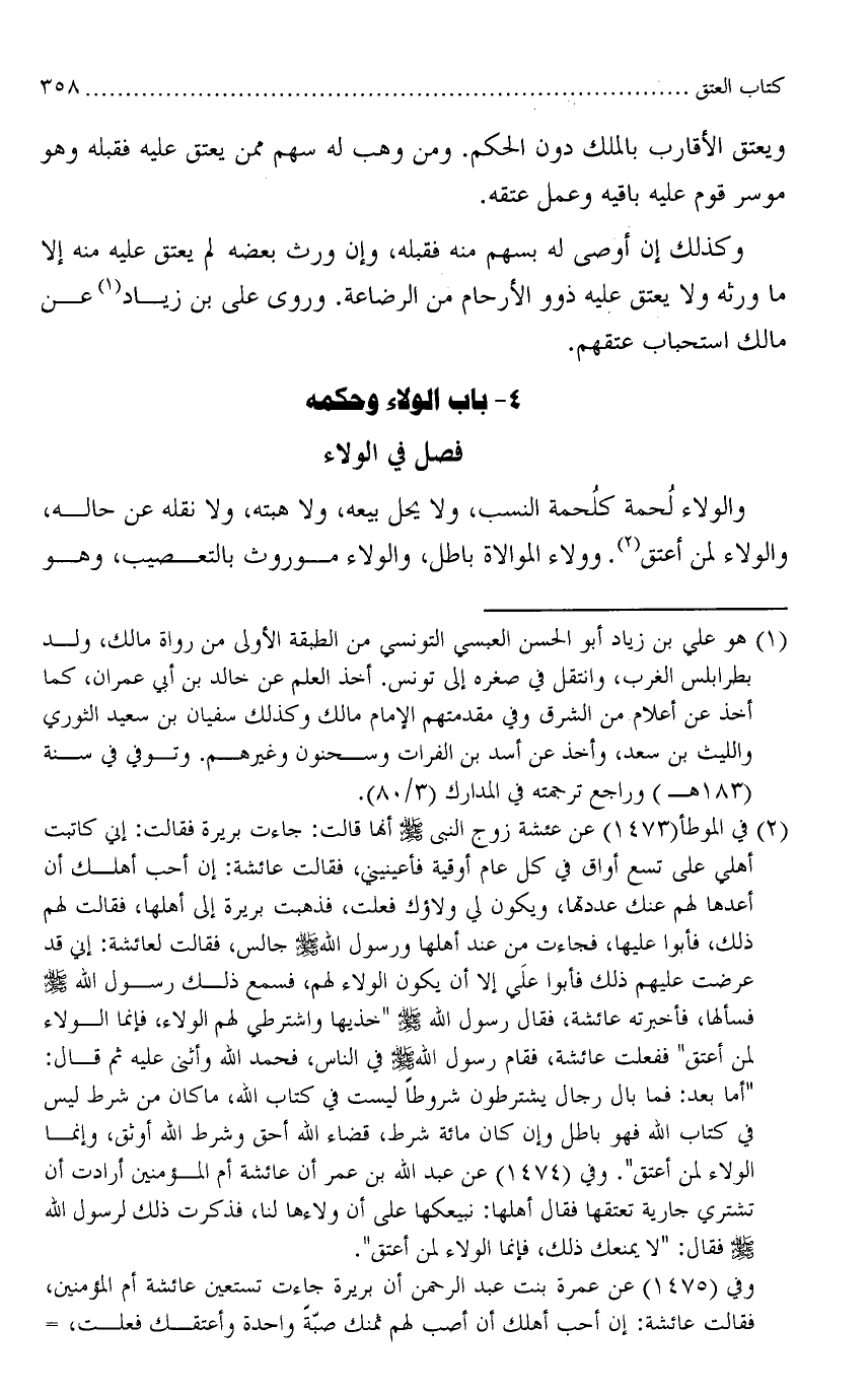والولاء لُحمة كلُحمة النسب، ولا يحل بيعه، ولا هبته، ولانقله عن حاله، والولاء لمن أعتق. وولاء الموالاة باطل، والولاء موروث بالتعصيب، وهو