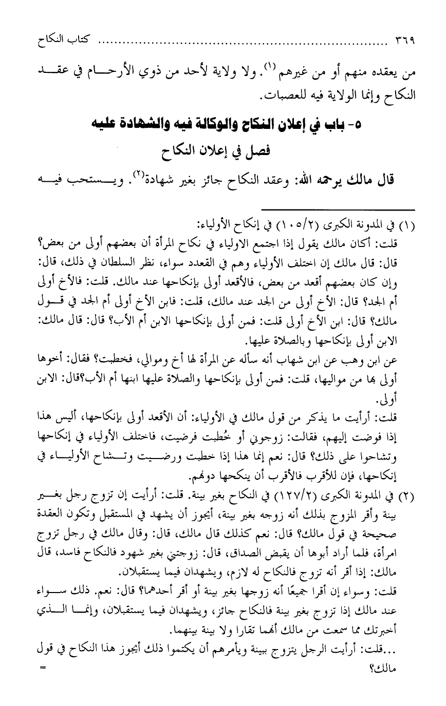 قال مالك يرحمه الله: وعقد النكاح جائز بغير شهادة. ويستحب فيه