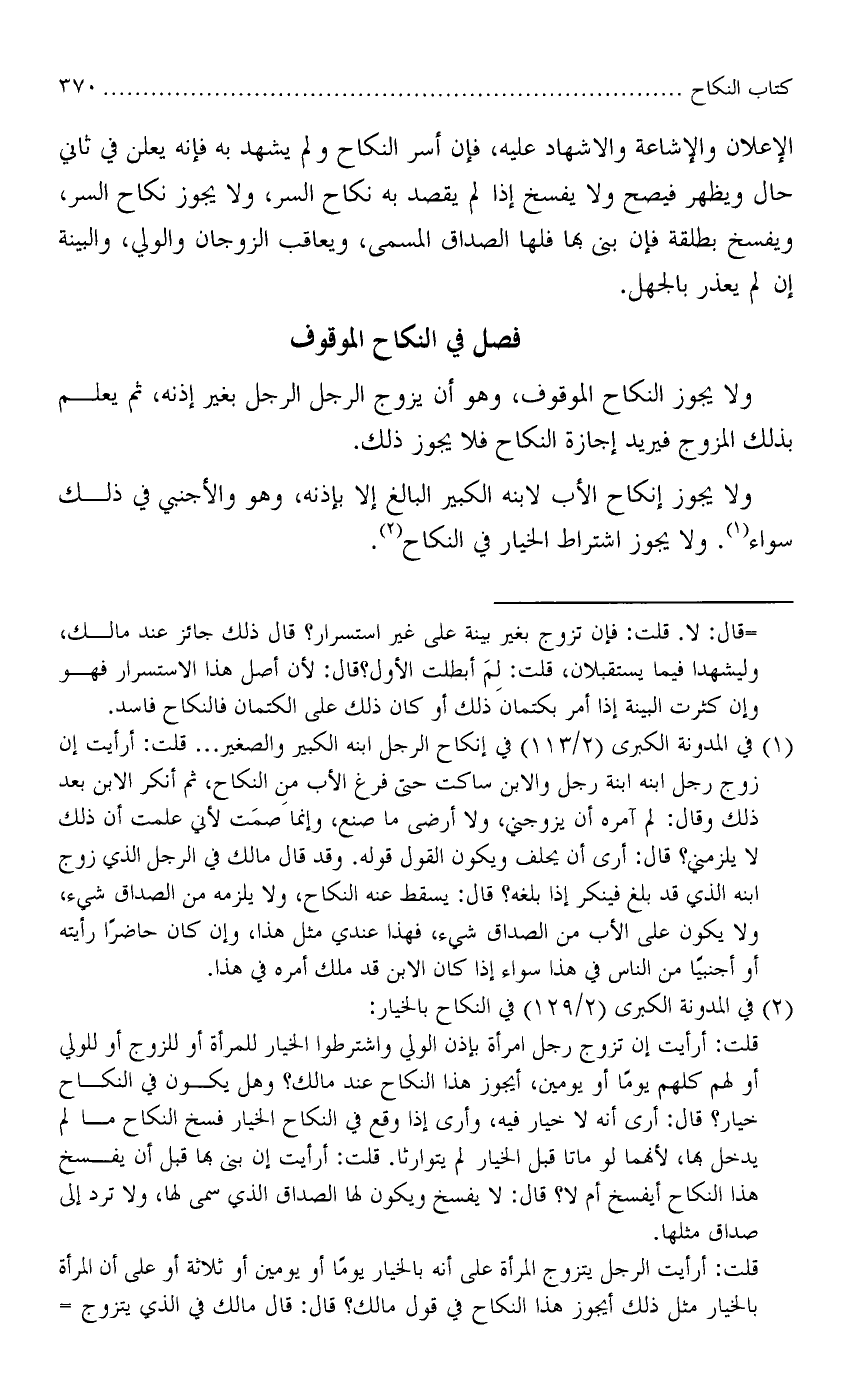 ولا يجوز إنكاح الأب لابنه الكبير البالغ إلا بإذنه، وهووالأجنبي في ذلك سواء. ولا يجوز اشتراط الخيار في النكاح.