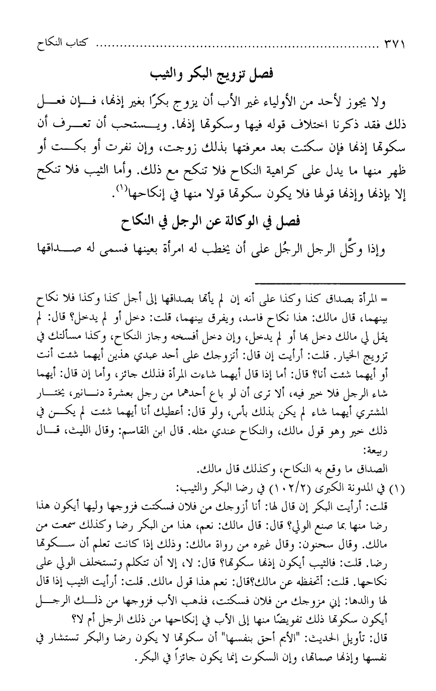 ولا يجوز لأحد من الأولياء غير الأب أن يزوج بكرًا بغير إذنها، فإن فعل ذلك فقد ذكرنا اختلاف قوله فيها وسكوتها إذنها. ويستحب أن تعرف أن سكوتها إذنها فإن سكتت بعد معرفتها بذلك زوجت، وإن نفرت أو بكت أو ظهر منها ما يدل على كراهية النكاح فلا تنكح مع ذلك. وأما الثيب فلاتنكح إلا بإذنها وإذنها قولها فلايكون سكوتها قولاً منها في إنكاحها.