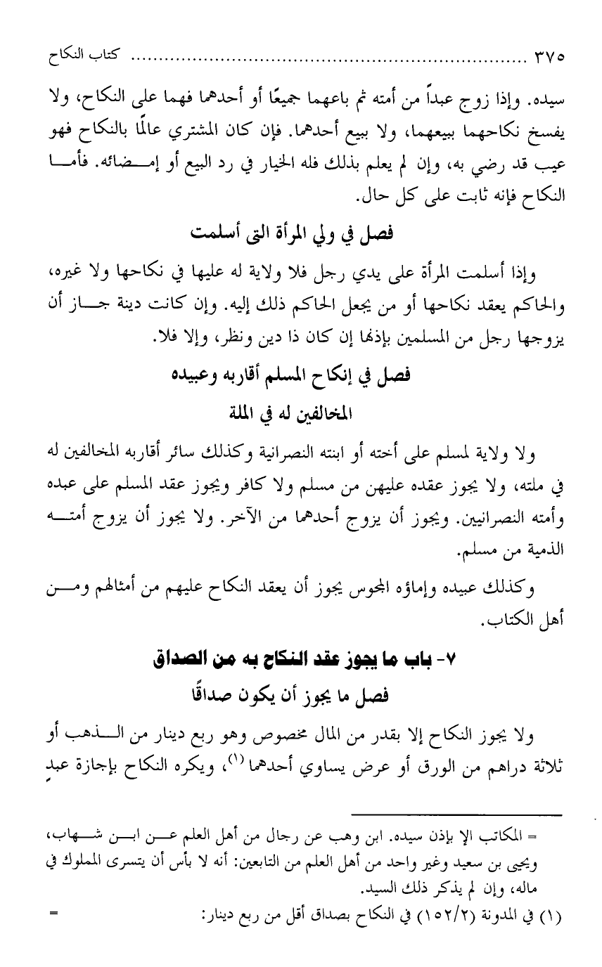 ولا ولاية لمسلم على أخته أو ابنته النصرانية وكذلك سائر أقاربه المخالفين له في ملته، ولا يجوز عقدهعليهن من مسلم ولا كافر ويجوز عقد المسلم على عبده وأمته النصرانيين. ويجوز أن يزوج أحدهما من الآخر. ولا يجوز أن يزوج أمته الذمية من مسلم.