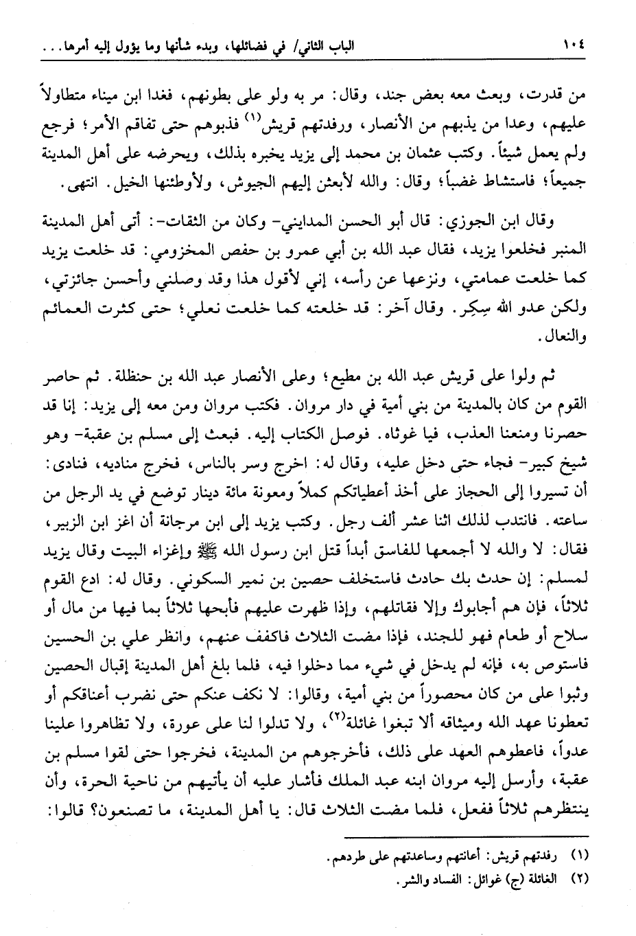 قلت: وسياق كلام القرطبي يقتضي أنها هي السبب في خروج أهل المدينة المذكور في كلام عياض؛ فإنه ذكر نحو كلام عياض، وقال: فلما انتهى حالها- يعني المدينة- كمالا وحسنا تناقص أمرها إلى أن أقفرت جهاتها، وتوالت الفتن فيها؛ فخاف أهلها، فارتحلوا عنها، ووجّه يزيد بن معاوية مسلم بن عقبة المري في جيش عظيم من أهل الشام، فنزل بالمدينة، فقاتل أهلها، فهزمهم وقتلهم بحرة المدينة قتلا ذريعا، واستباح المدينة ثلاثة أيام، فسميت وقعة الحرة لذلك، ويقال لها: حرة زهرة، وكانت الوقعة بموضع يعرف بواقم على ميل من المسجد النبوي، فقتل بقايا المهاجرين والأنصار وخيار التابعين، وهم ألف وسبعمائة، وقتل من أخلاط الناس عشرة آلاف سوى النساء والصبيان، وقتل بها من حملة القرآن سبعمائة رجل، ومن قريش سبعة وتسعون قتلوا ظلما في الحرب صبرا، قال: وقال الإمام الحافظ ابن حزم في المرتبة الرابعة: وجالت الخيل في مسجد رسول الله صلّى الله عليه وسلّم وبالت، وراثت بين القبر والمنبر أدام الله تشريفها وأكرهوا الناس أن يبايعوا ليزيد على أنهم عبيد له إن شاء باع وإن شاء أعتق، وذكر له يزيد بن عبد الله بن زمعة البيعة على حكم القرآن والسنة، فأمر بقتله، فضربت عنقه صبرا، وذكر الأخباريون أنها خلت من أهلها، وبقيت ثمارها للعوافي كما قال صلّى الله عليه وسلّم وفي حال خلائها غذت الكلاب على سواري المسجد، انتهى كلام القرطبي.