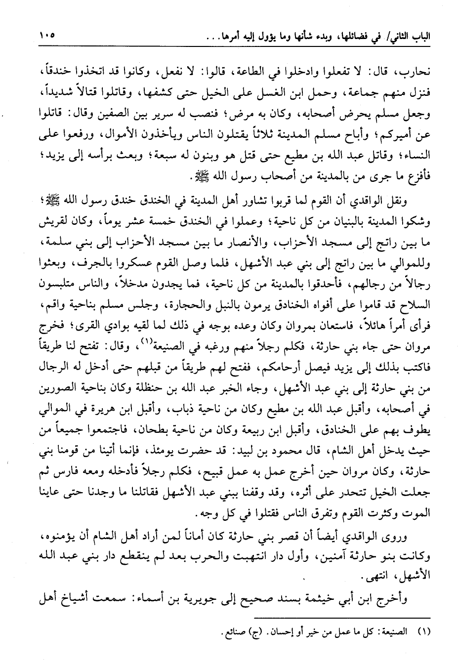 قلت: وفي كتاب الحرة للواقدي ما ملخصه: أن أول ما هاج أمر الحرة أن ابن ميناء كان عاملا على صوافي «1» المدينة- وبها يومئذ صواف كثيرة- حتى كان معاوية يجد بالمدينة وأعراضها مائة ألف وسق وخمسين ألف وسق، ويحصد مائة ألف وسق حنطة، واستعمل يزيد على المدينة عثمان بن محمد بن أبي سفيان؛ وأن ابن ميناء أقبل بشرج له من الحرة يريد الأموال التي كانت لمعاوية؛ فلم يزل يسوقه ولا يصده عنه أحد حتى انتهى إلى بلحارث بن الخزرج، فنقب النقيب فيهم، فقالوا: ليس ذلك لك، هذا حدث وضرر علينا، فأعلم الأمير عثمان بن محمد بذلك، فأرسل إلى ثلاثة من بلحارث، فأجابوه إلى أن يمر به، فأعلم ابن ميناء فغدا بأصحابه فذبّوهم «2» ، فرجع إلى الأمير فقال: اجمع لهم