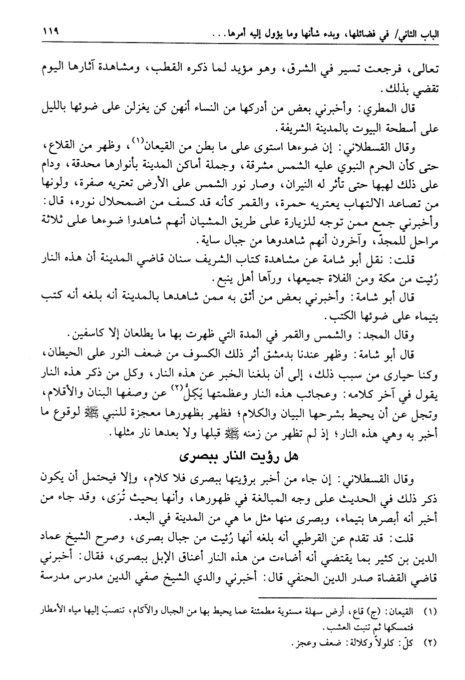 وذكر القسطلاني عمن يثق به أن أمير المدينة أرسل عدة من الفرسان إلى هذه النار للإتيان بخبرها، فلم تجسر الخيل على القرب منها، فترجل أصحابها وقربوا منها، فذكروا أنها ترمي بشرر كالقصر، ولم يظفروا بجلية أمرها، فجرد عزمه للإحاطة بخبرها، فذكر أنه وصل منها إلى قدر غلوتين بالحجر ولم يستطع أن يجاوز موقفه من حرارة الأرض وأحجار كالمسامير تحتها نار سارية ومقابله ما يتصاعد من اللهب، فعاين نارا كالجبال الراسيات، والتلال المجتمعة السائرات، تقذف بزبد الأحجار كالبحار المتلاطمة الأمواج، وعقد لهيبها